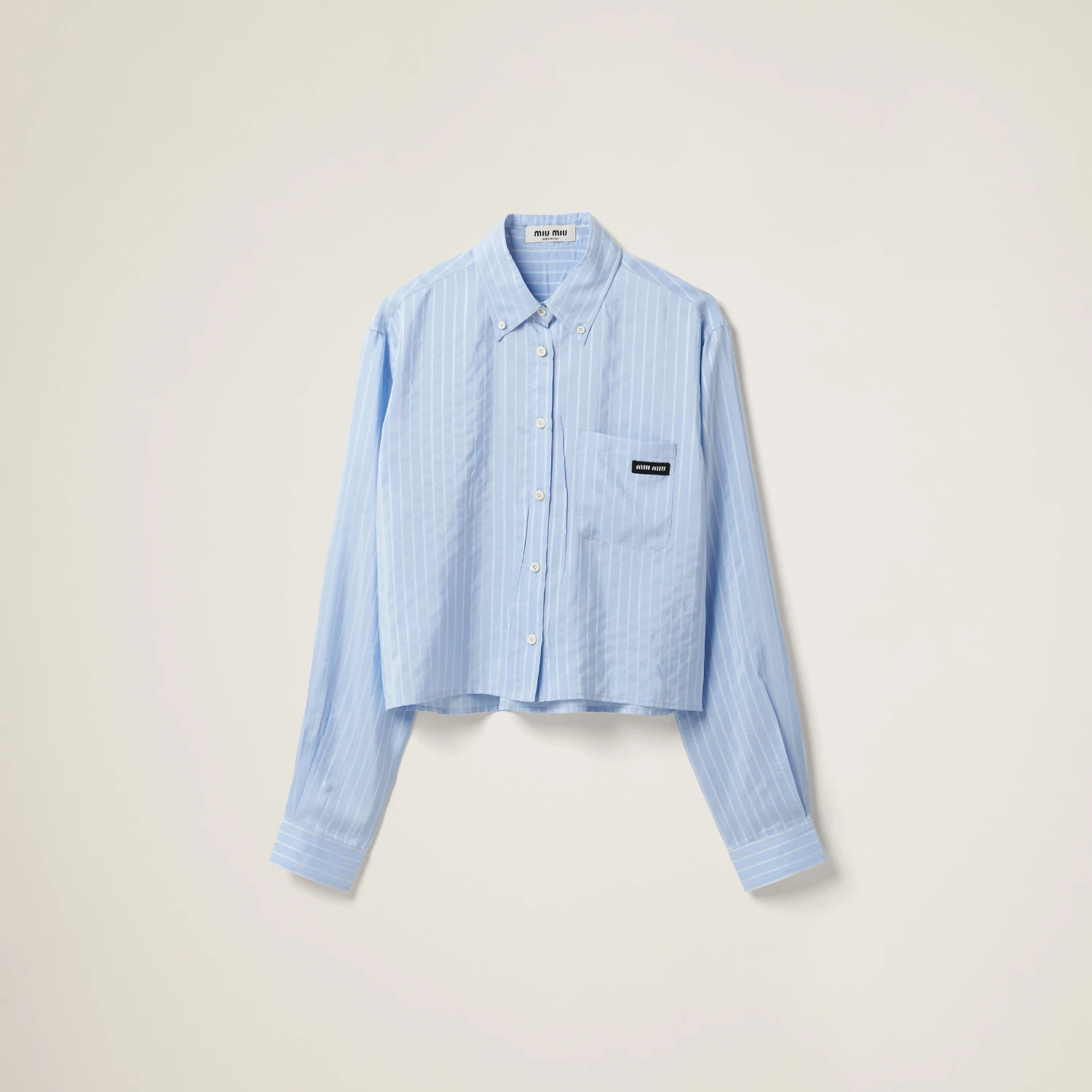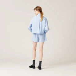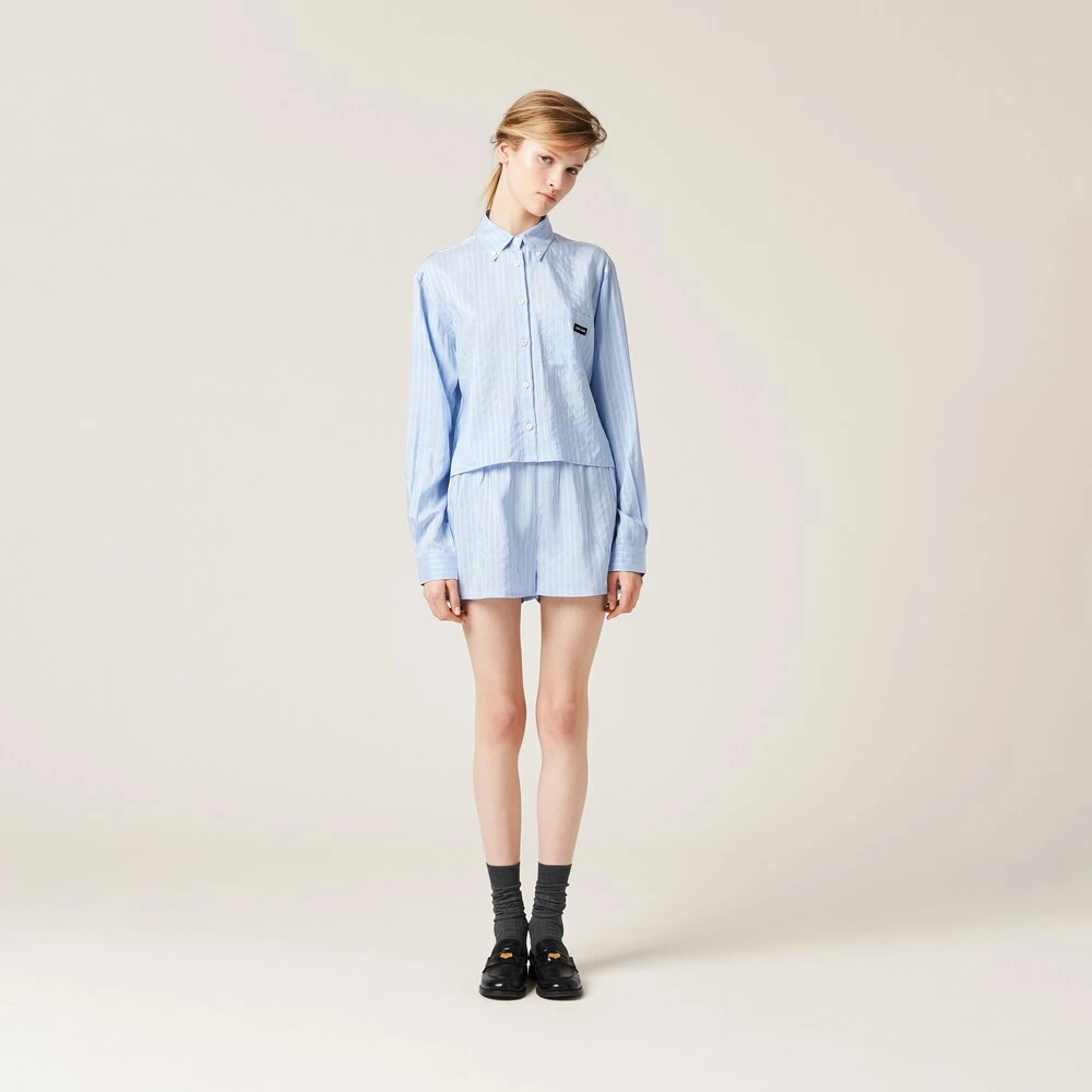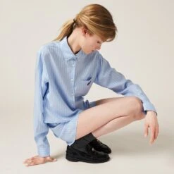 Menswear inspirations and indoor references are combined in this pongé shirt. The boxy lines accentuate the contemporary character of the garment, while classic shirt details are joined by the contrasting logo on the breast pocket that completes the design with an iconic note.