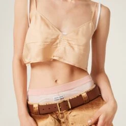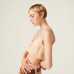 Present on the catwalk during the Spring-Summer 2023 show, this pongé top expresses a notion of fashion as a means of translating a reaction to reality into material form. The layering of fabrics, colors, and styles animates surfaces, underscoring the notion that each concept, in its translation, mutates to take on a new form and a different truth.