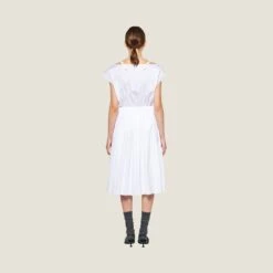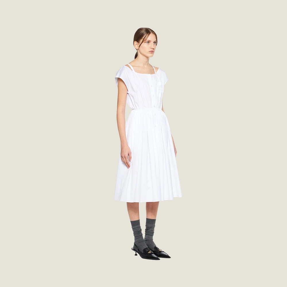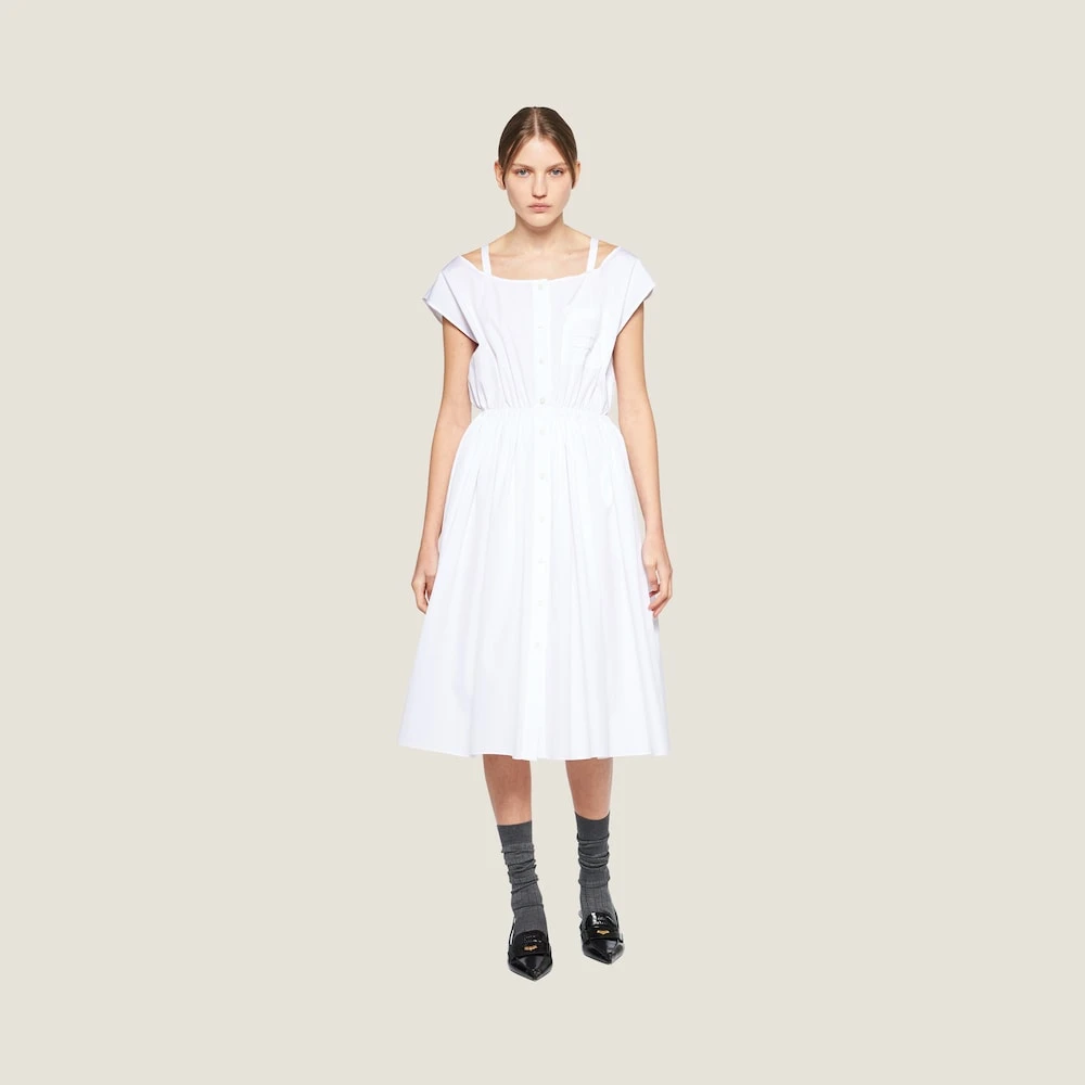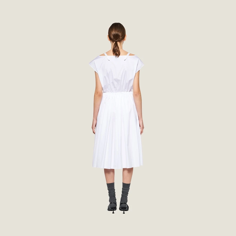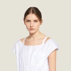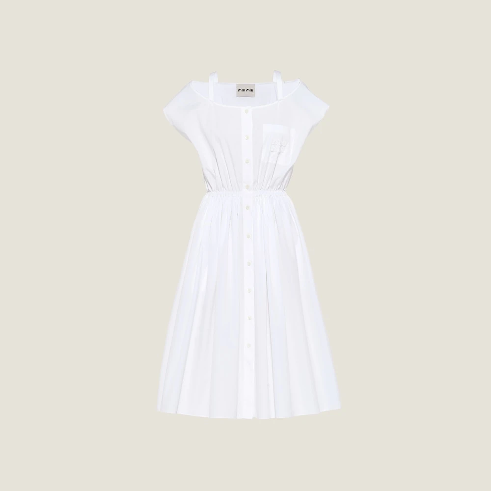 Fresh, casual femininity characterizes the new poplin dress. A prairie inspiration is combined with the boat neck, raw-cut edges, and elasticized waist that creates playful contrasts in volume. The embroidered logo completes the design with an unexpected iconic and distinctive note.