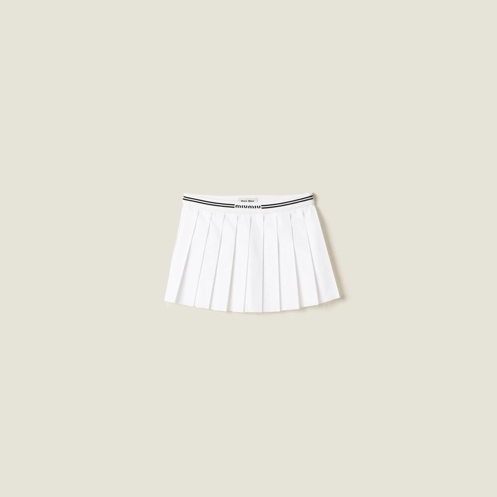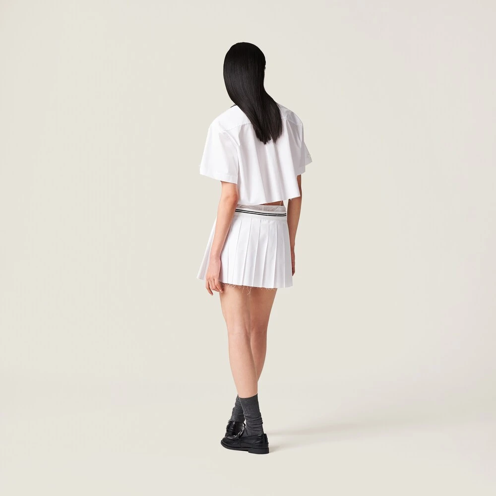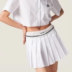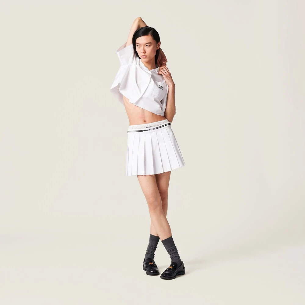 A style inspired by the tennis world meets Miu Miu’s dynamic and modern femininity in this poplin miniskirt. The crisp fabric features pleating that adds movement, while the jacquard knit logo echoing the waistband completes the design with a refined contrast and distinctive, iconic note.