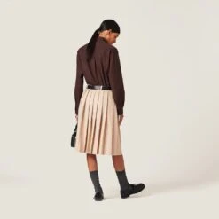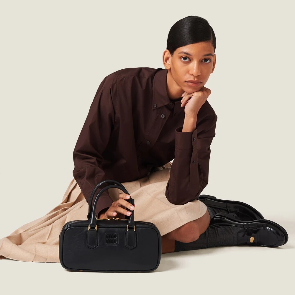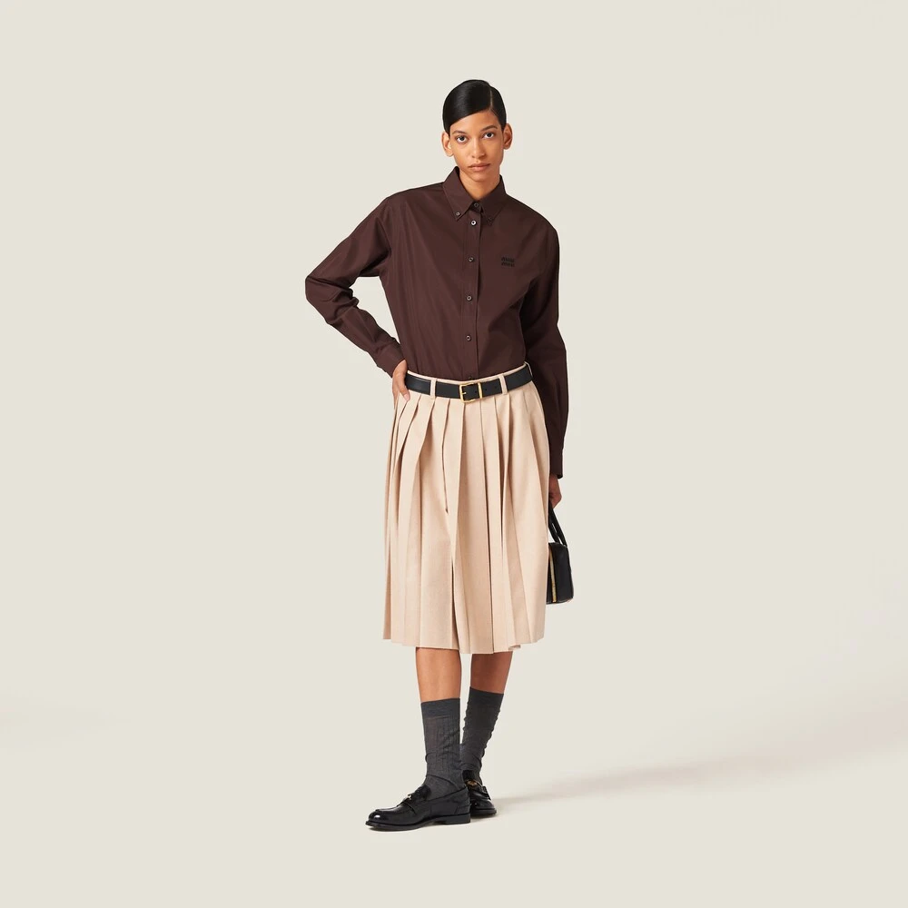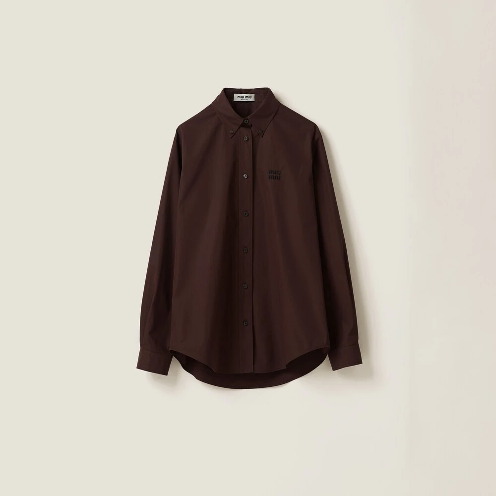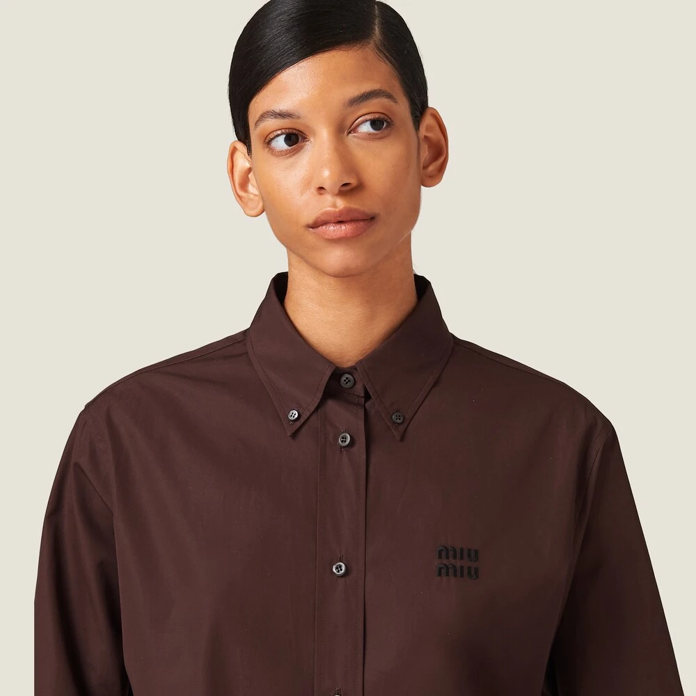Miu Miu’s embroidered tonal logo stands out on the sleek lines of this poplin shirt, adding an iconic note to the garment.