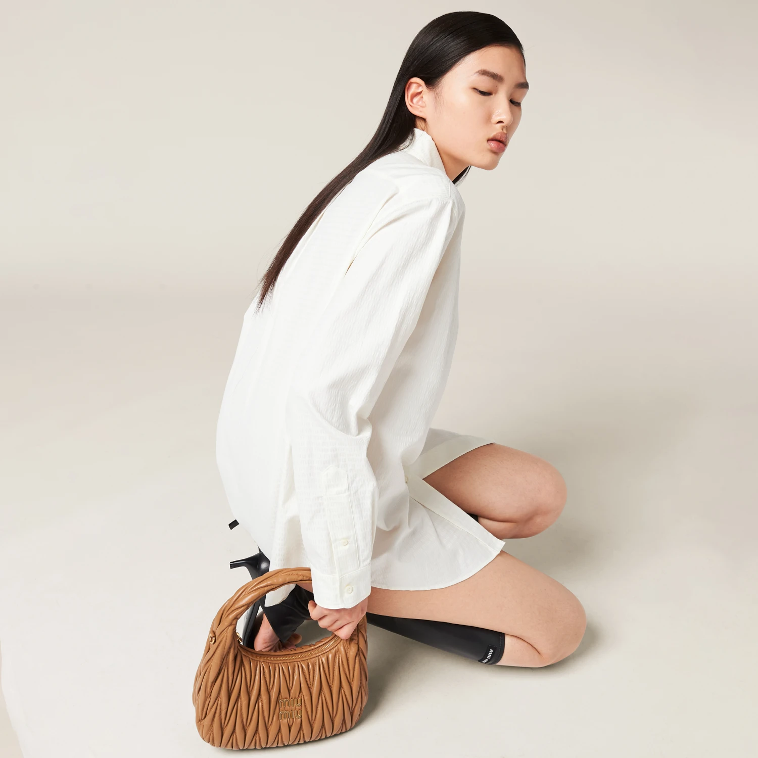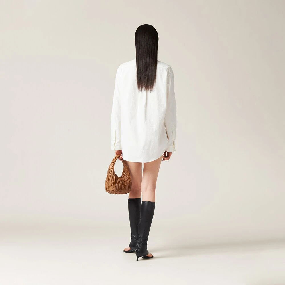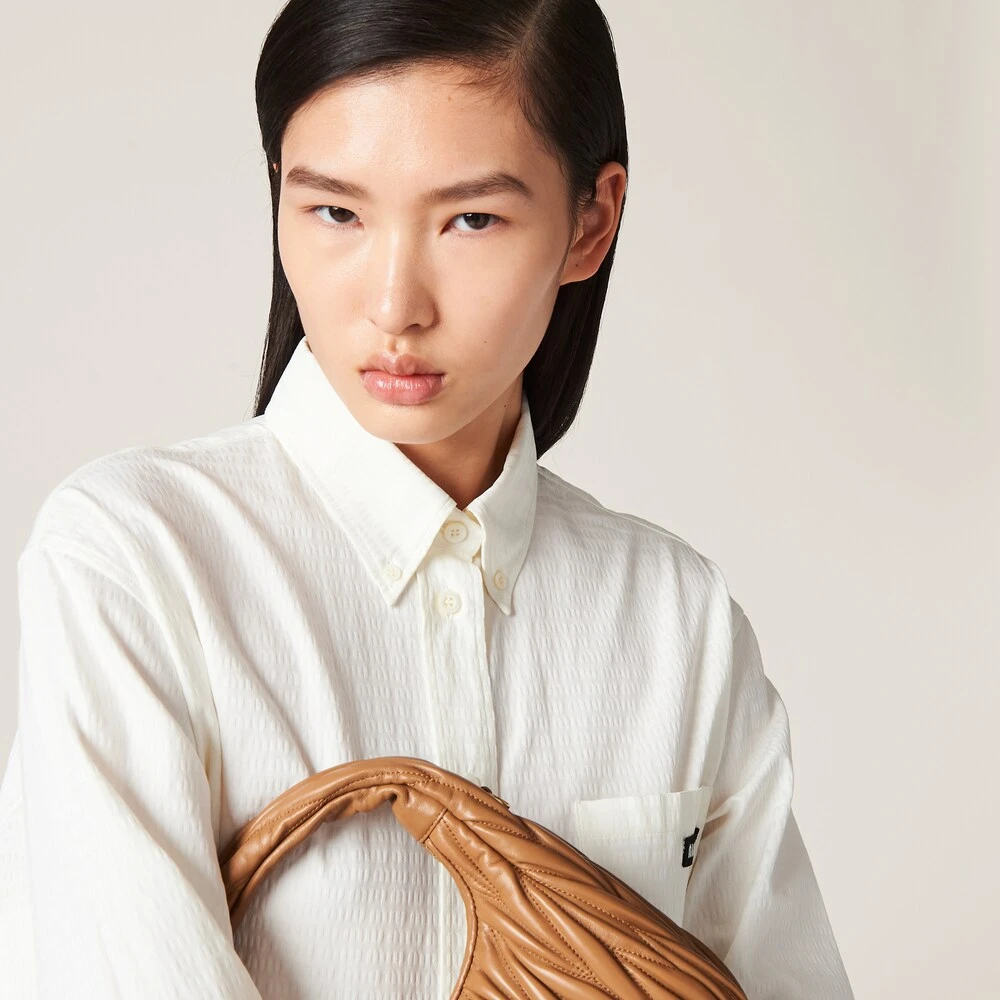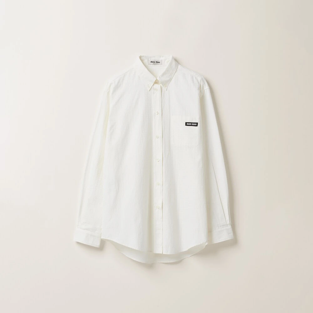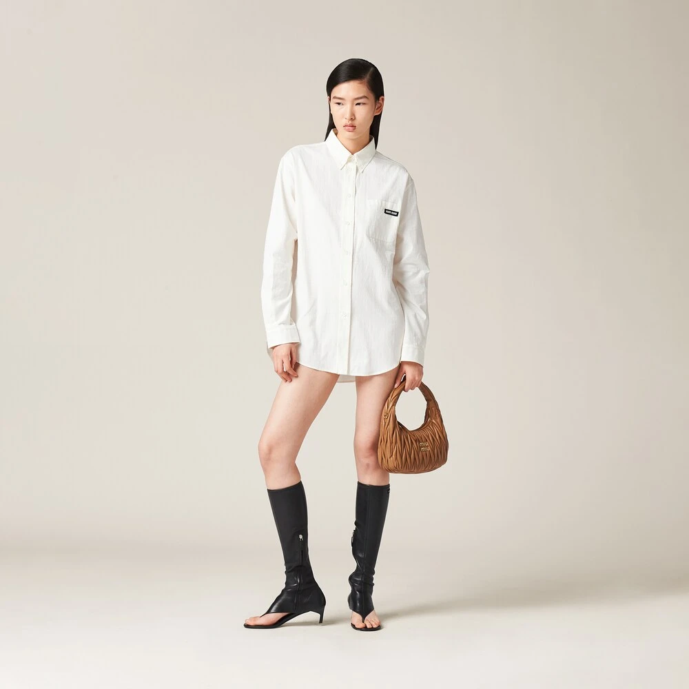 The sleek, classic lines of the poplin shirt meet Miu Miu’s captivating attitude. The patch pocket on the chest features the knit logo label that adds a color contrast and a distinctive note to the garment.