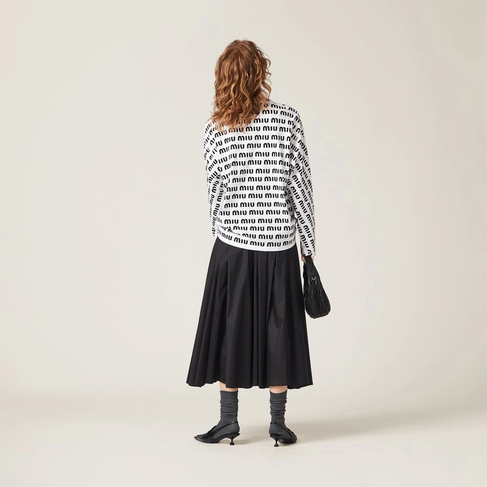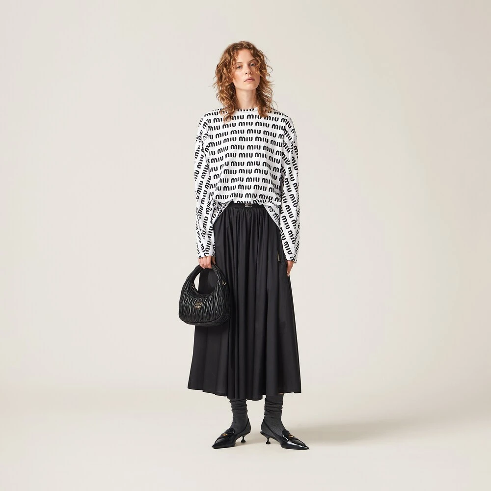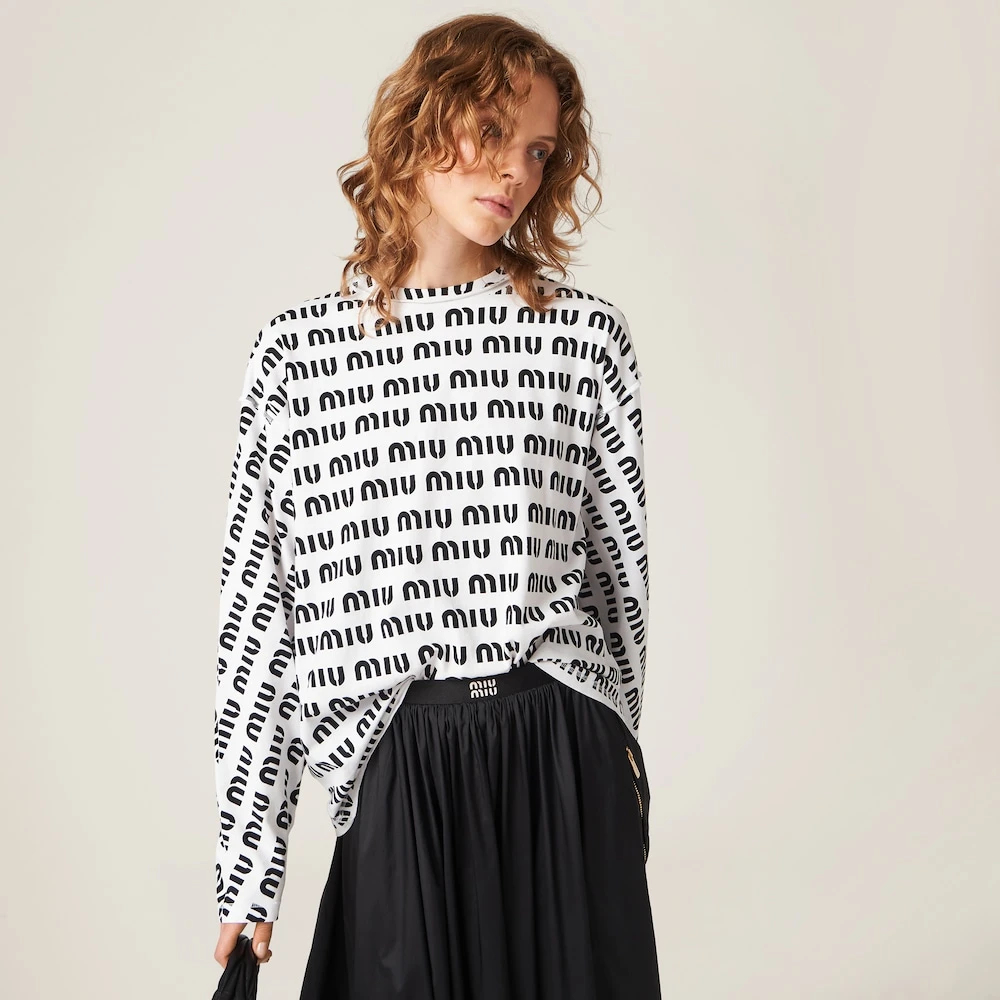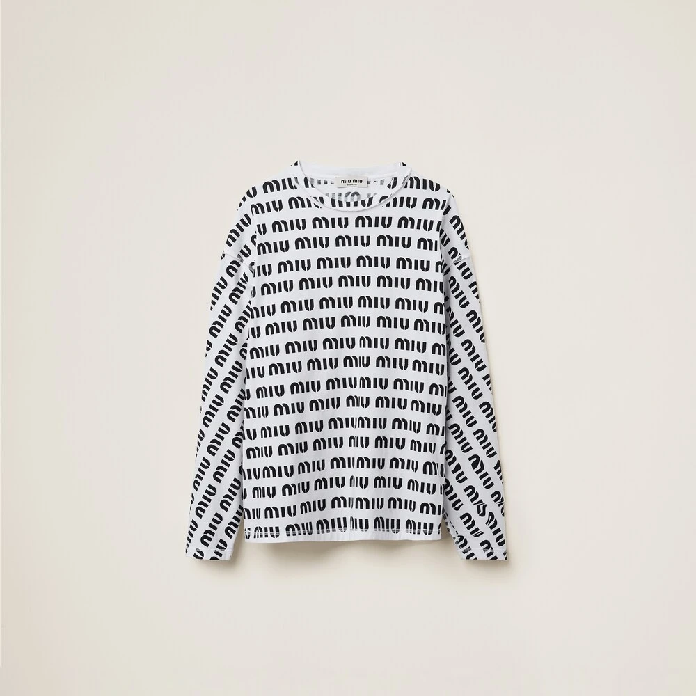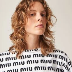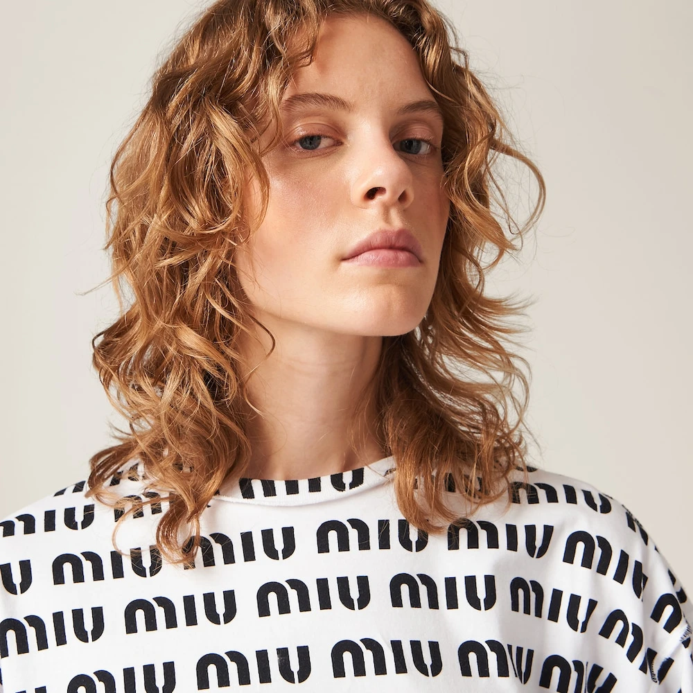 The iconic Miu Miu print logo almost entirely covers this new cotton tee. The play of contrasts, oversized silhouette, and bold style make this garment extremely contemporary.
