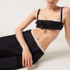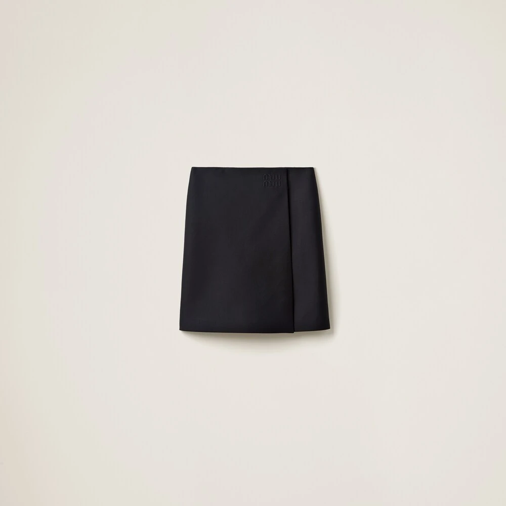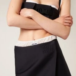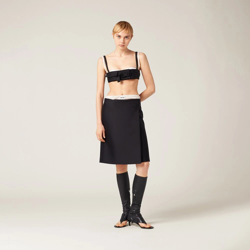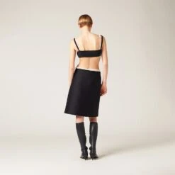 During the Spring-Summer 2023 show, this radzimir skirt represented a concept of fashion as an integral part of real life where utility, benefit, and service affect physical expression. Miu Miu’s sophisticated style reinterprets the classic pencil skirt with a contemporary twist. The embroidered tonal logo decorates this new vision of style.