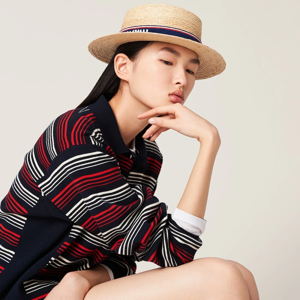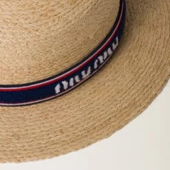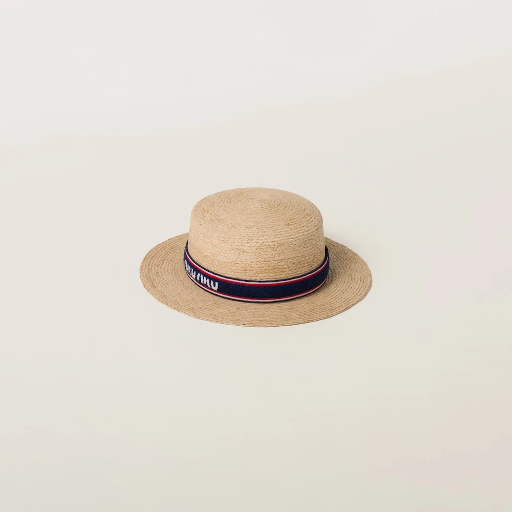 Summer suggestions and refined contrasts define the style of this new raffia hat. The rustic taste of the material is joined by the multicolored band in a contrasting color on which the Miu Miu logo stands out with lively, edgy femininity.