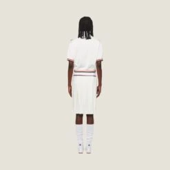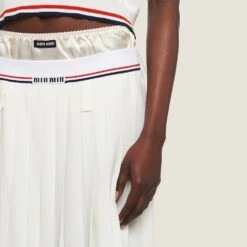 Familiar territories, new meanings. Sportswear inspires the shapes and details of the new Miu Miu collection with an eye on the tennis world. This pleated skirt made of sablé re-examines classic proportions and silhouettes.