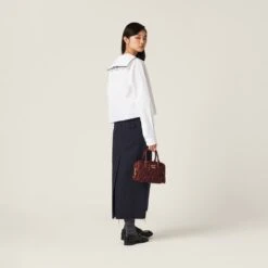 References from the nautical world meet Miu Miu’s irreverent femininity in this new sailor poplin shirt. The classic sailor collar with stripes in a contrasting color, the boxy lines, and the raw-cut hem define a captivating, contemporary, and provocative aesthetic. The embroidered logo stands out on the edge of the collar on the back, completing the design with an iconic note.