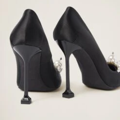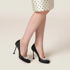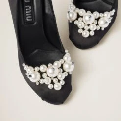 These satin pumps have a refined and captivating look. Artificial pearls stand out on the upper thanks to their contrasting color and texture.
