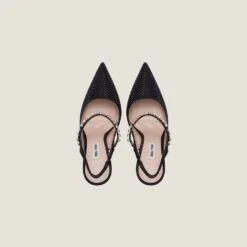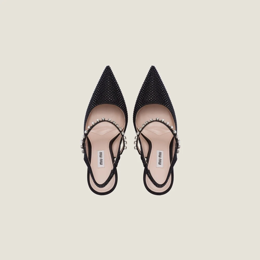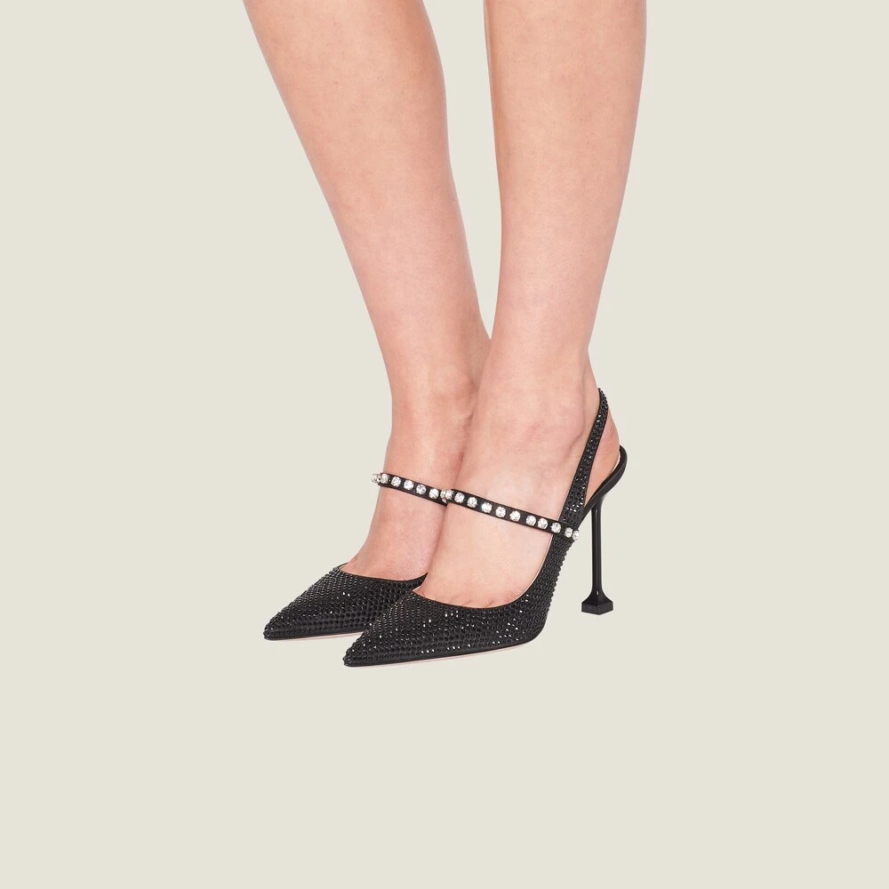 Luminous crystals embellish the ultra-feminine design of these satin slingbacks. They have a spike heel and curvy lines.