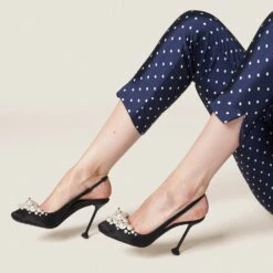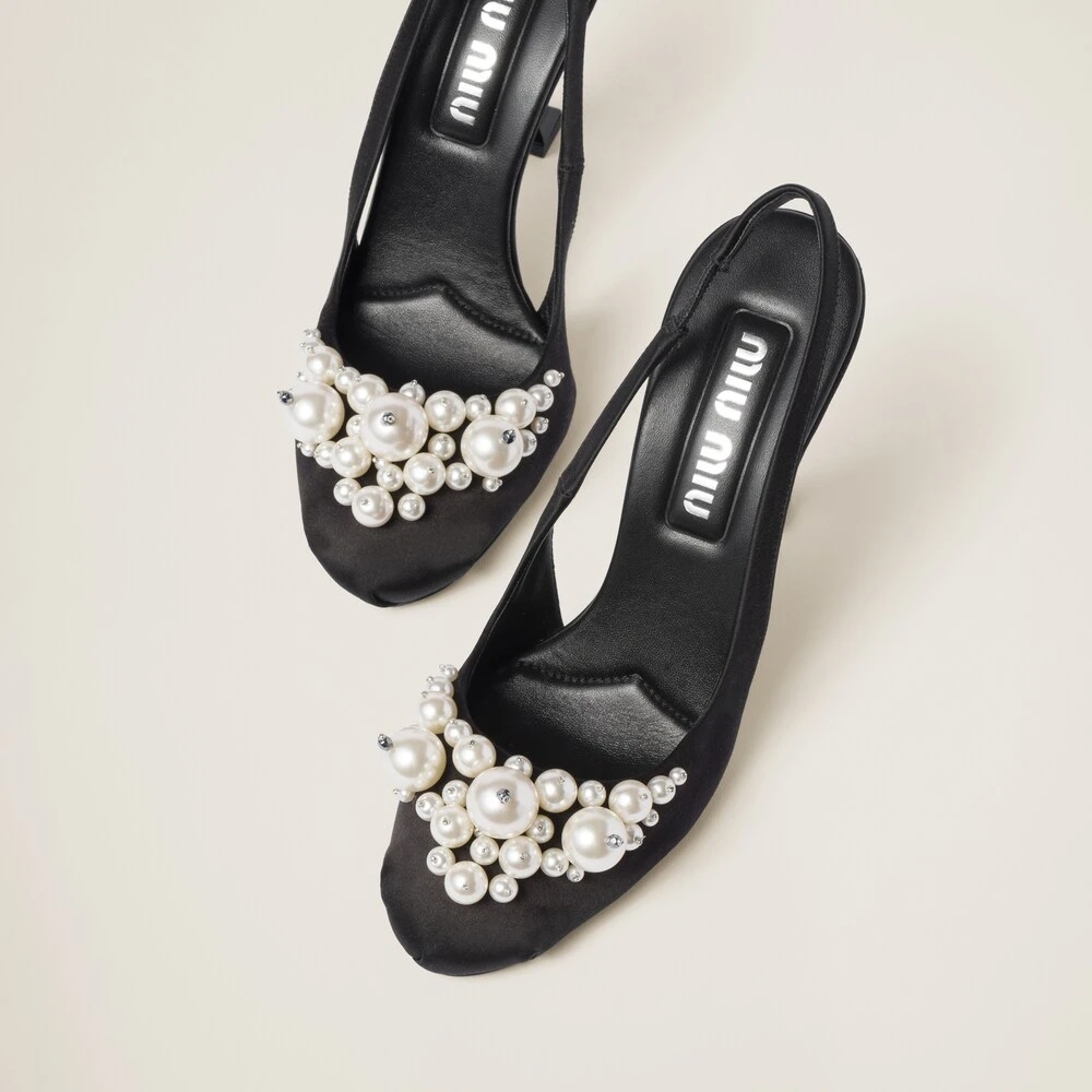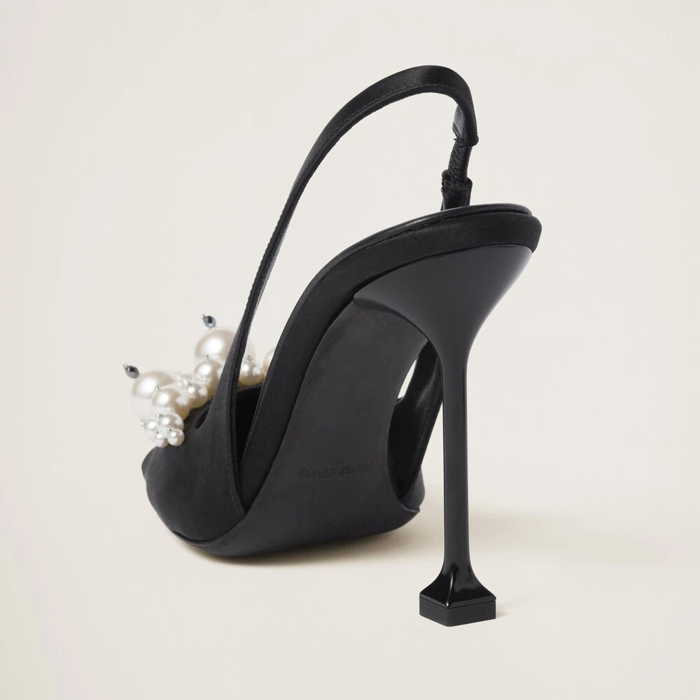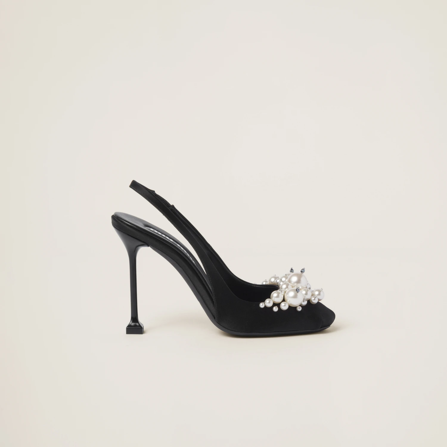 These satin slingback pumps have a refined and captivating look. Artificial pearls stand out on the upper thanks to their contrasting color and texture.
