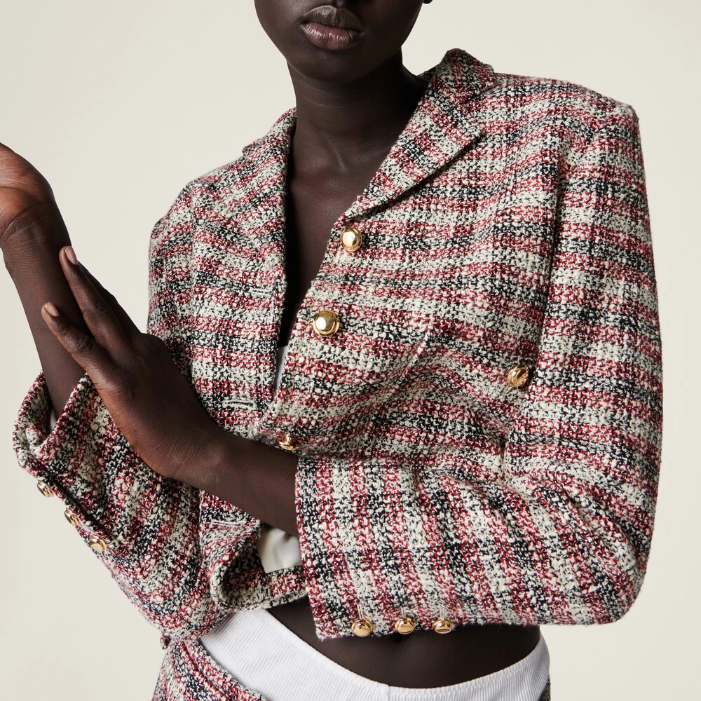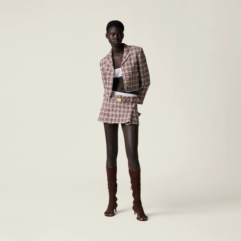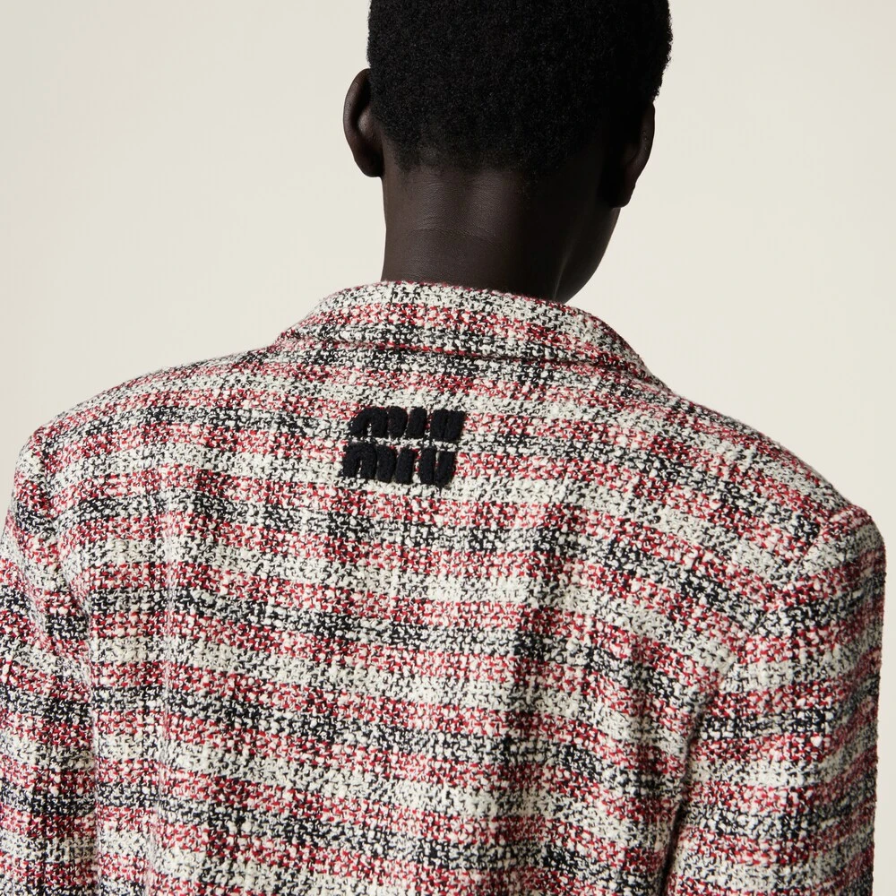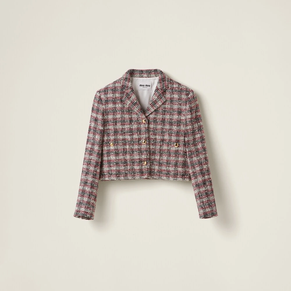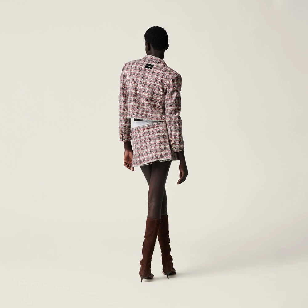 Classical inspiration and bon ton style meet Miu Miu’s bold and rebellious personality in this jacket. The check pattern is made of sophisticated colors while metal buttons add a refined contrast and shiny touches to the garment. The cropped lines consolidate the contemporary attitude of the jacket while the contrasting logo behind the neck completes the design with an unexpected iconic note.