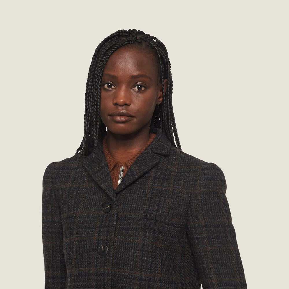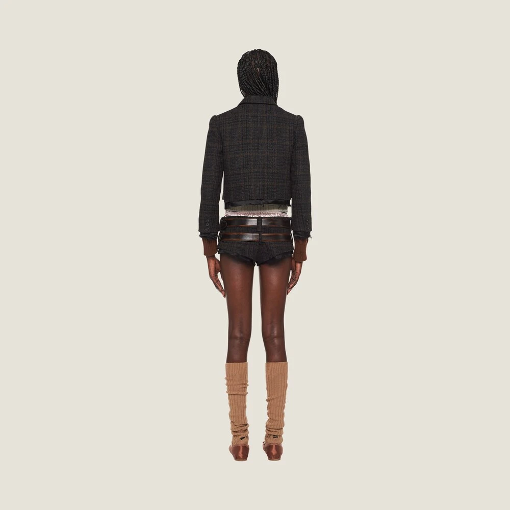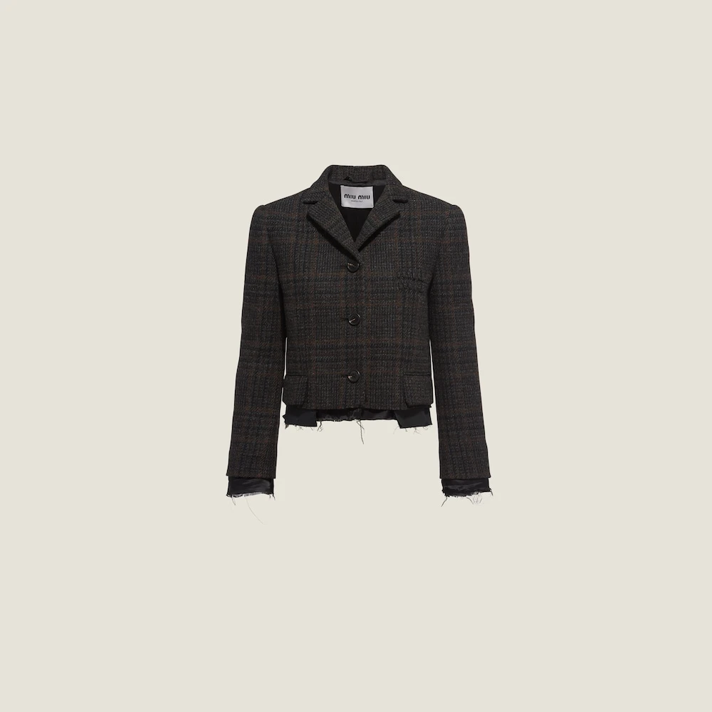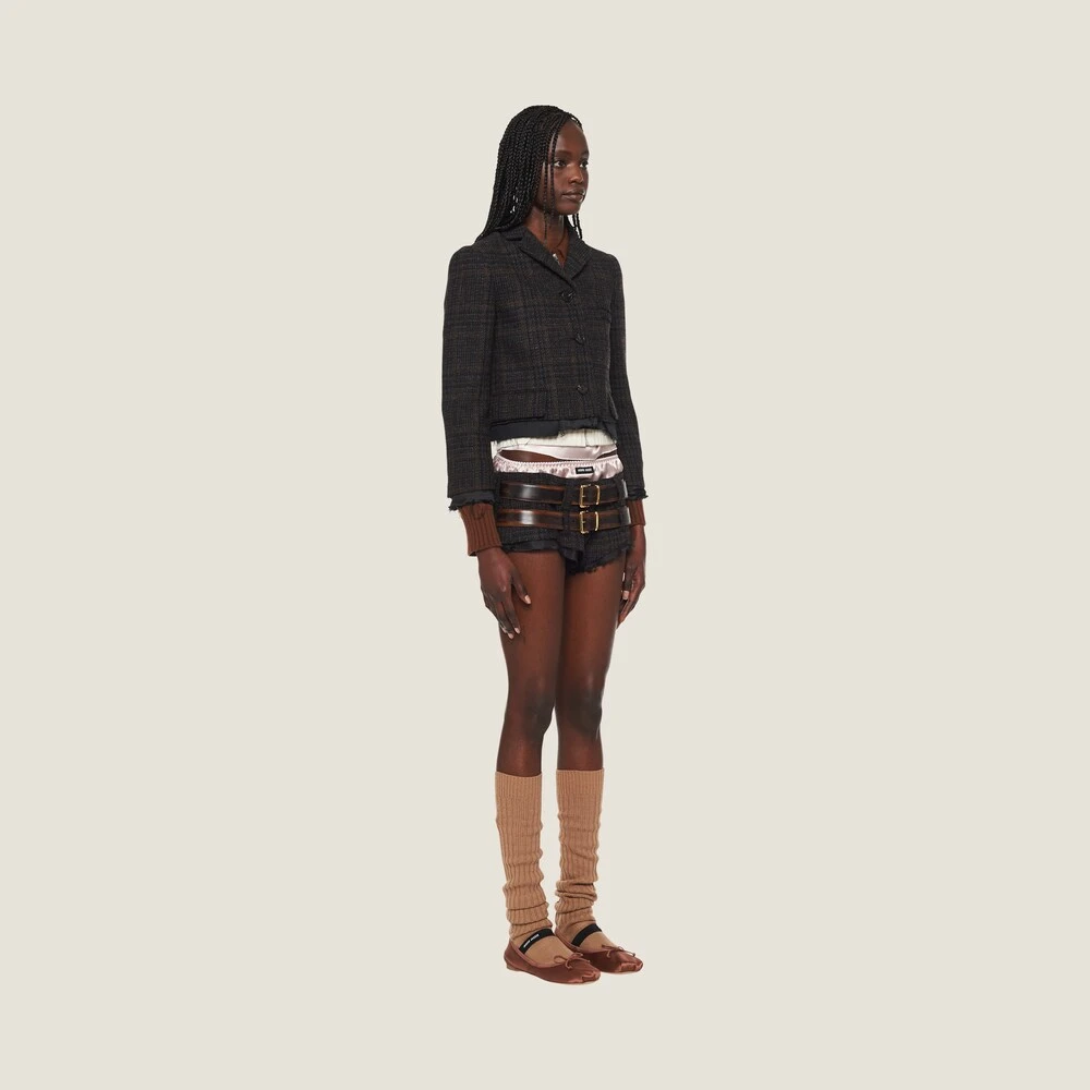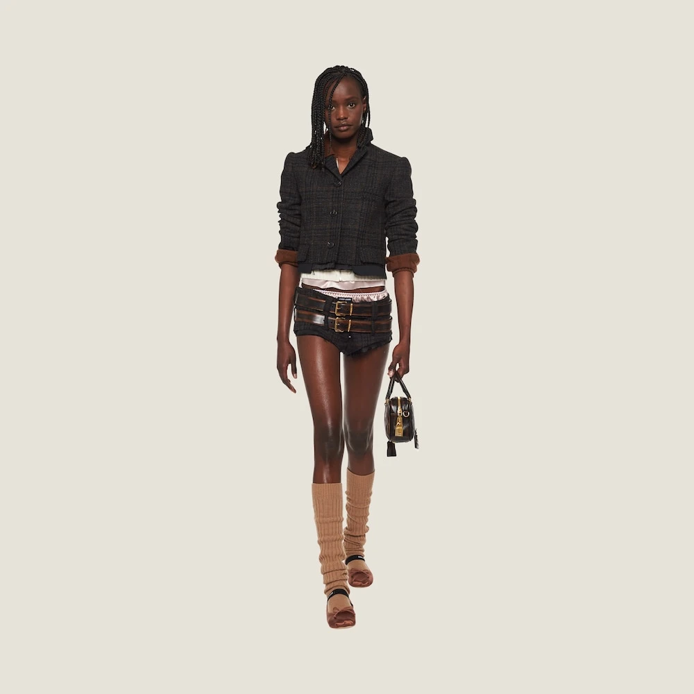 Classic pieces are reinterpreted through new proportions and precious details in the new Miu Miu collection. Combining iconic fabrics from classic tailoring and innovation, the collection represents a reaction and reflection of reality. A new balance of proportions is achieved by cutting the garments, maintaining the credibility of each and modifying their relationship with the body. The edges of the lining that peek out under the jacket are unfinished, part of a construction process left exposed to underline the spontaneity of these actions.