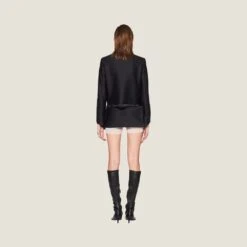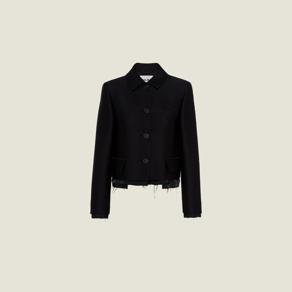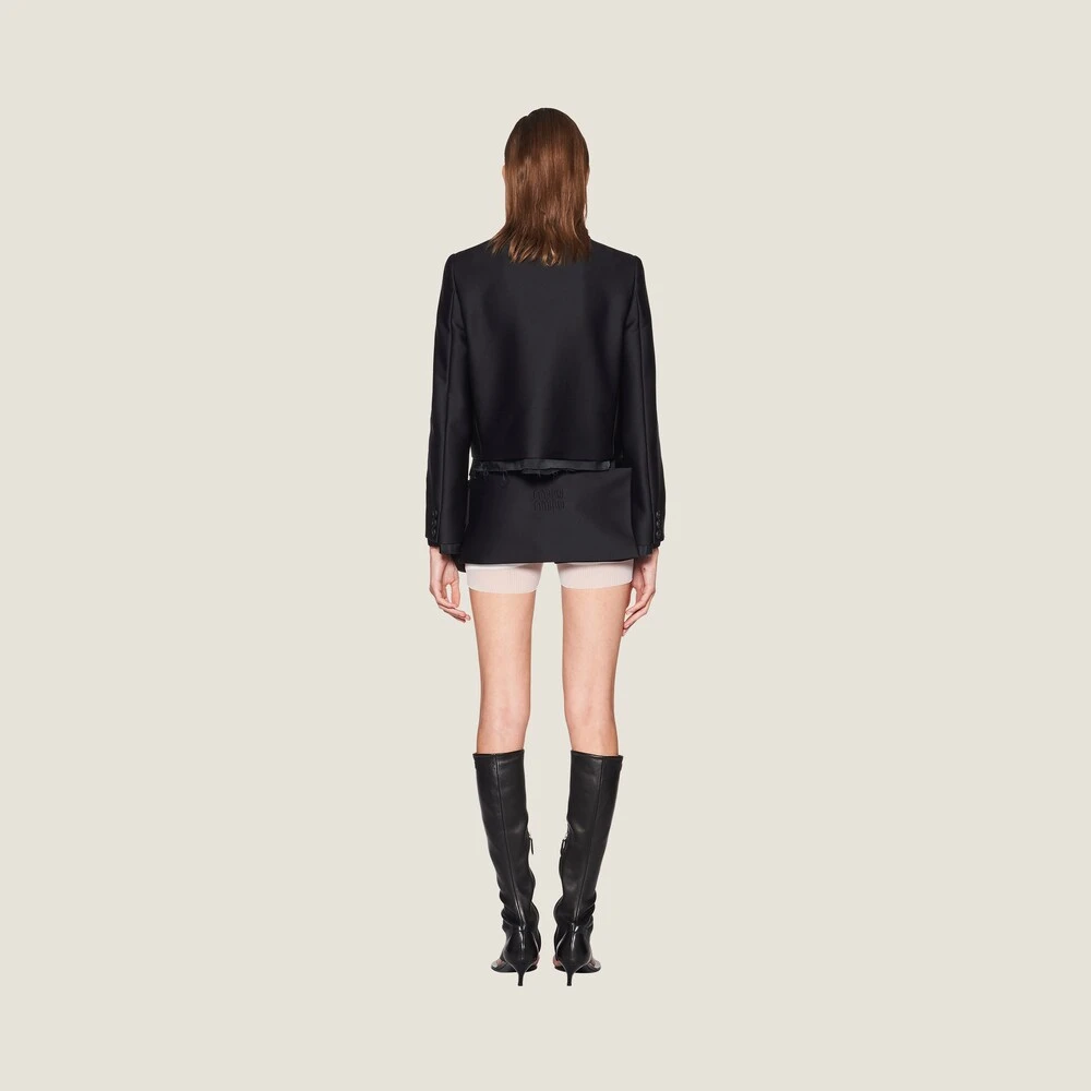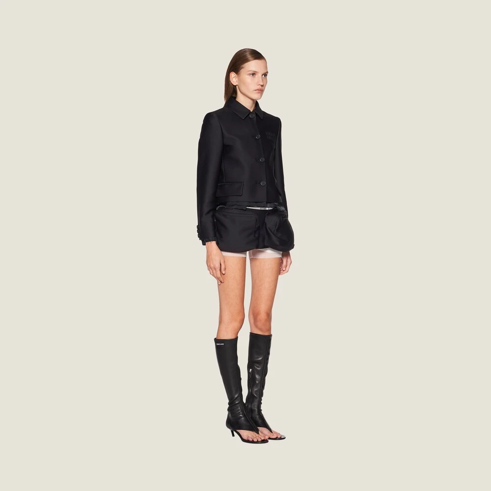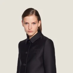 This single-breasted radzimir jacket that appeared on the catwalk for the Spring-Summer 2023 collection expresses a notion of fashion as a means of translating a reaction to current reality into a material form. The garment subverts classic aesthetic rules, mixing them with special materials and distinctive details. The silk lining ensures a comfortable fit, while the embroidered tonal logo conveys the idea of Miu Miu’s free and irreverent femininity.