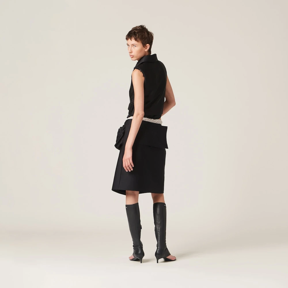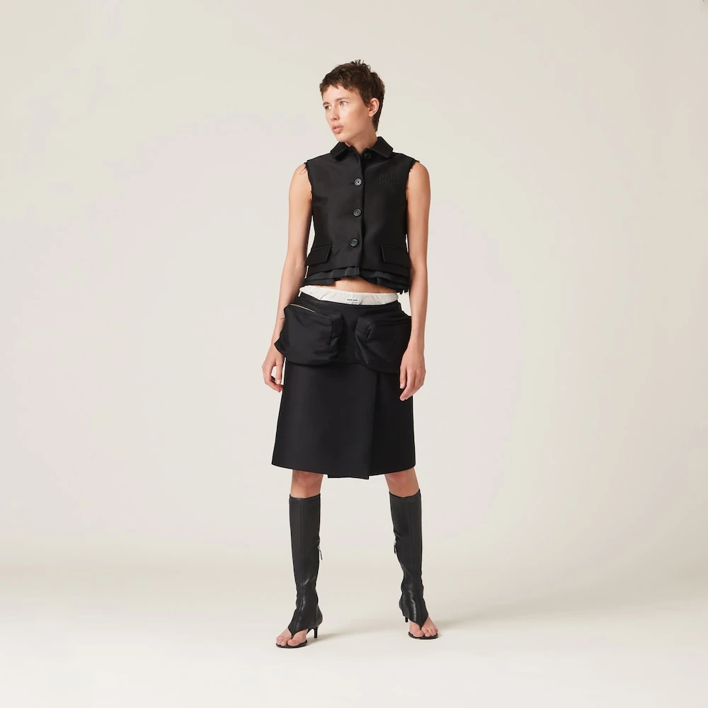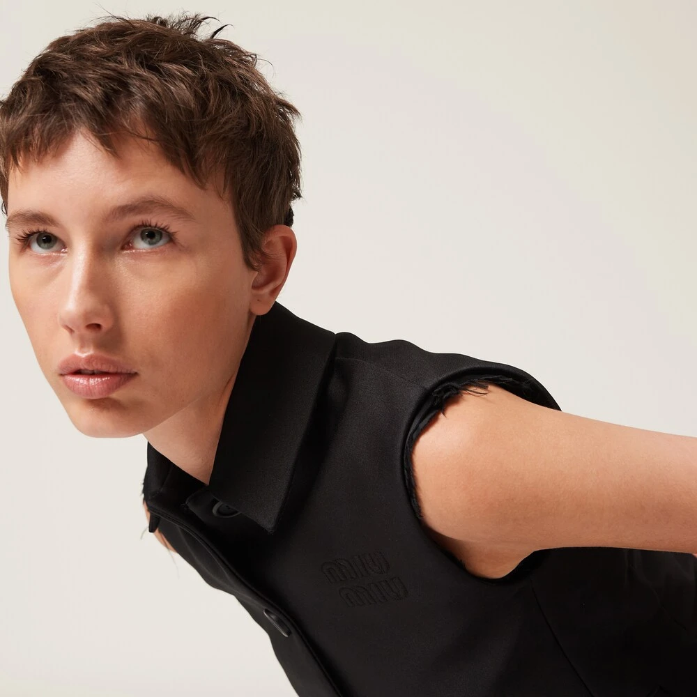 The single-breasted radzimir vest that appeared on the catwalk for the Spring-Summer 2023 collection expresses a notion of fashion as a means of translating a reaction to current reality into a material form. The garment subverts classic aesthetic rules, mixing them with special materials and distinctive details. The silk lining ensures a comfortable fit, while the embroidered tonal logo conveys the idea of Miu Miu’s free and irreverent femininity.
