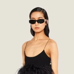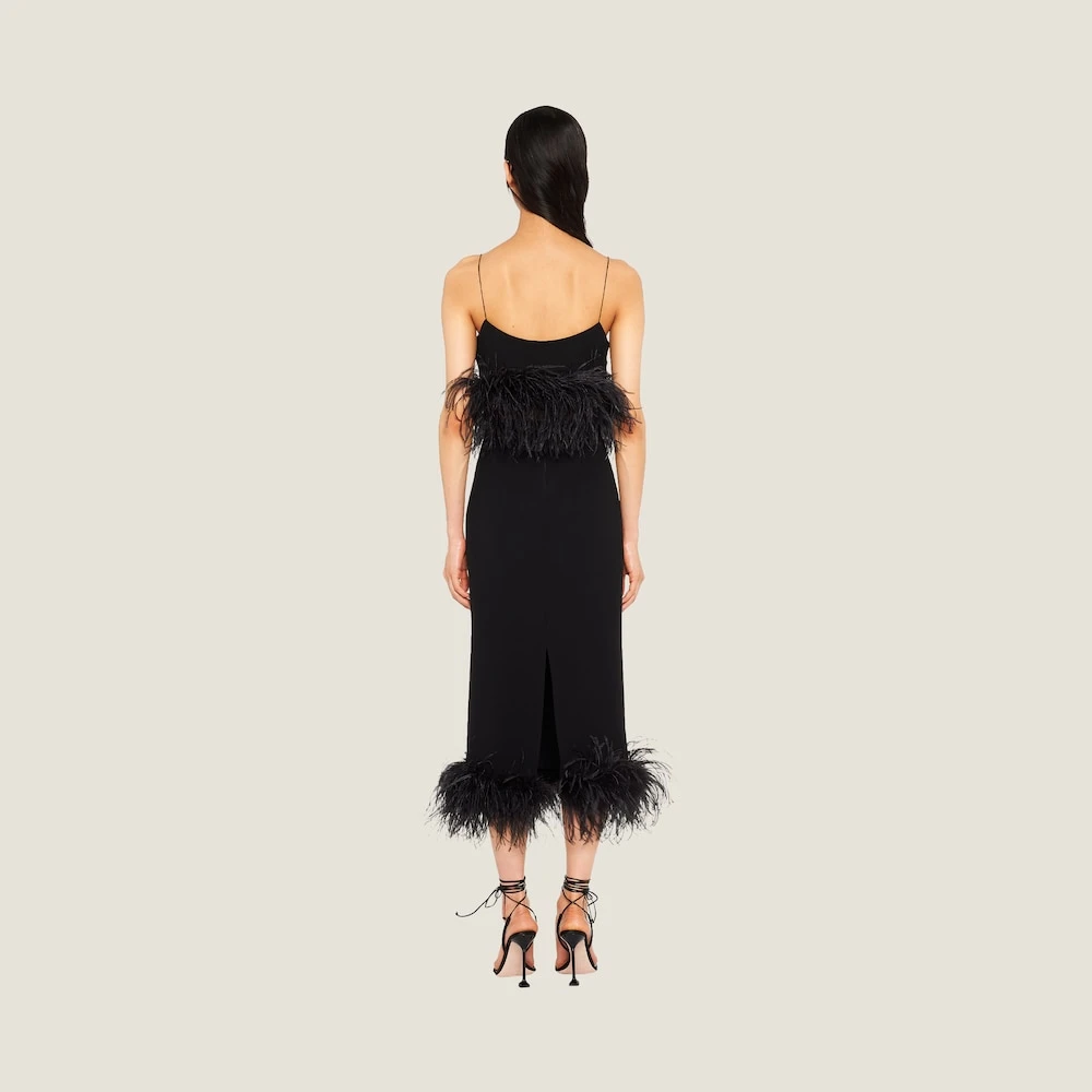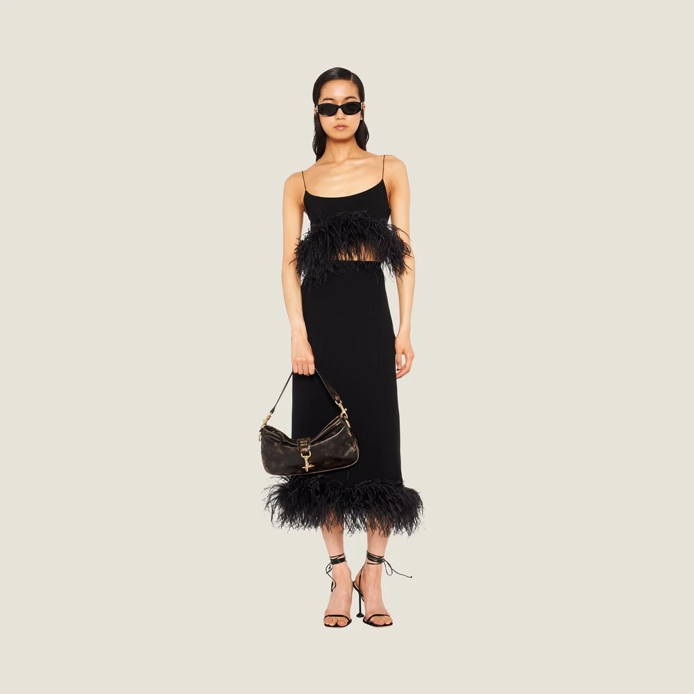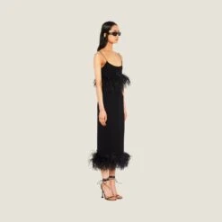 A soft feather trim decorates this stretch cady top. The flirty design updates women’s evening wear with ironic details.