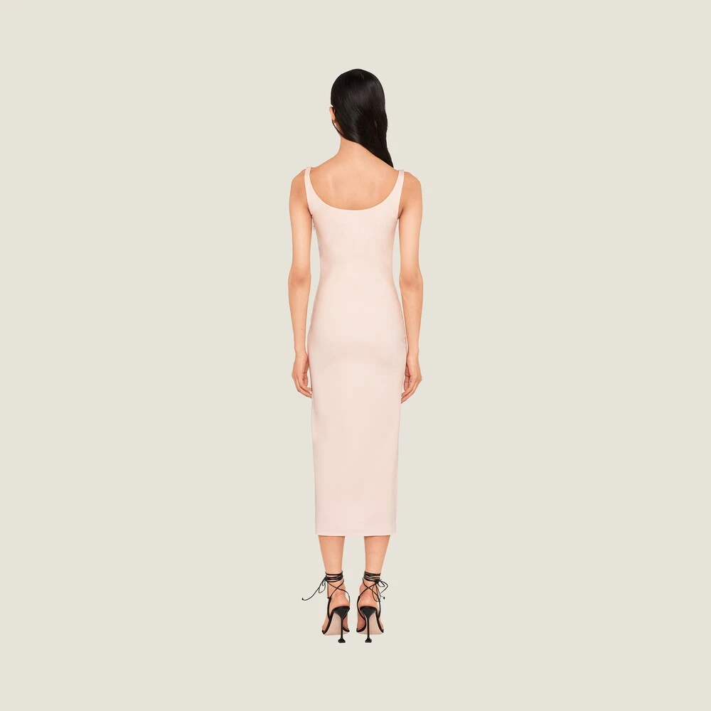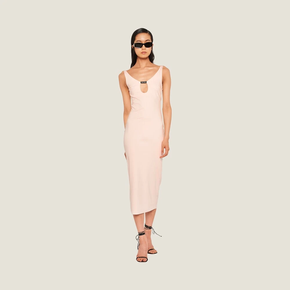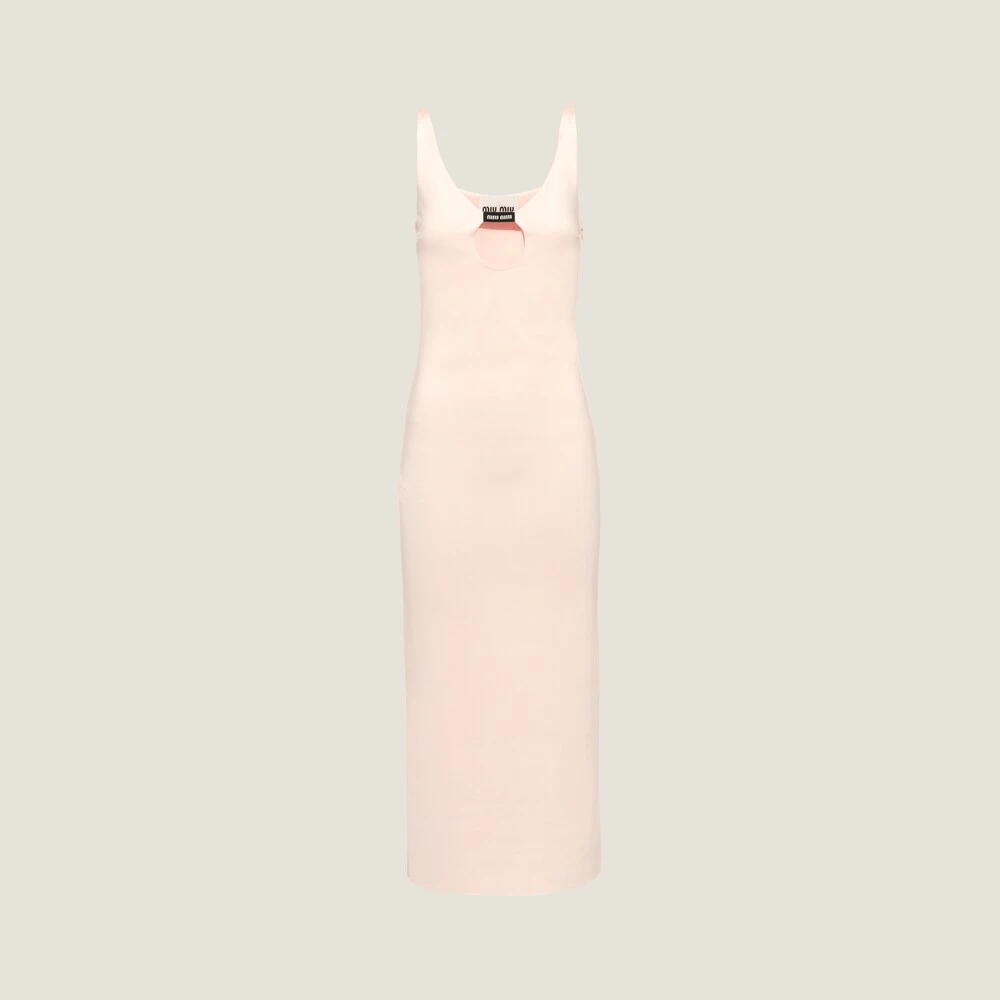 This sleek, ultra-feminine jersey dress is characterized by its minimalist silhouette accented with the Miu Miu jacquard logo in a contrasting color.
