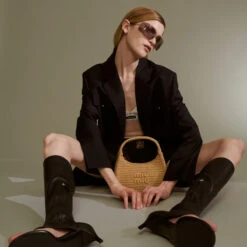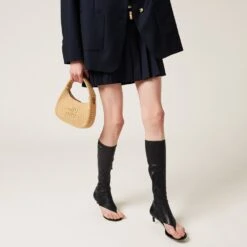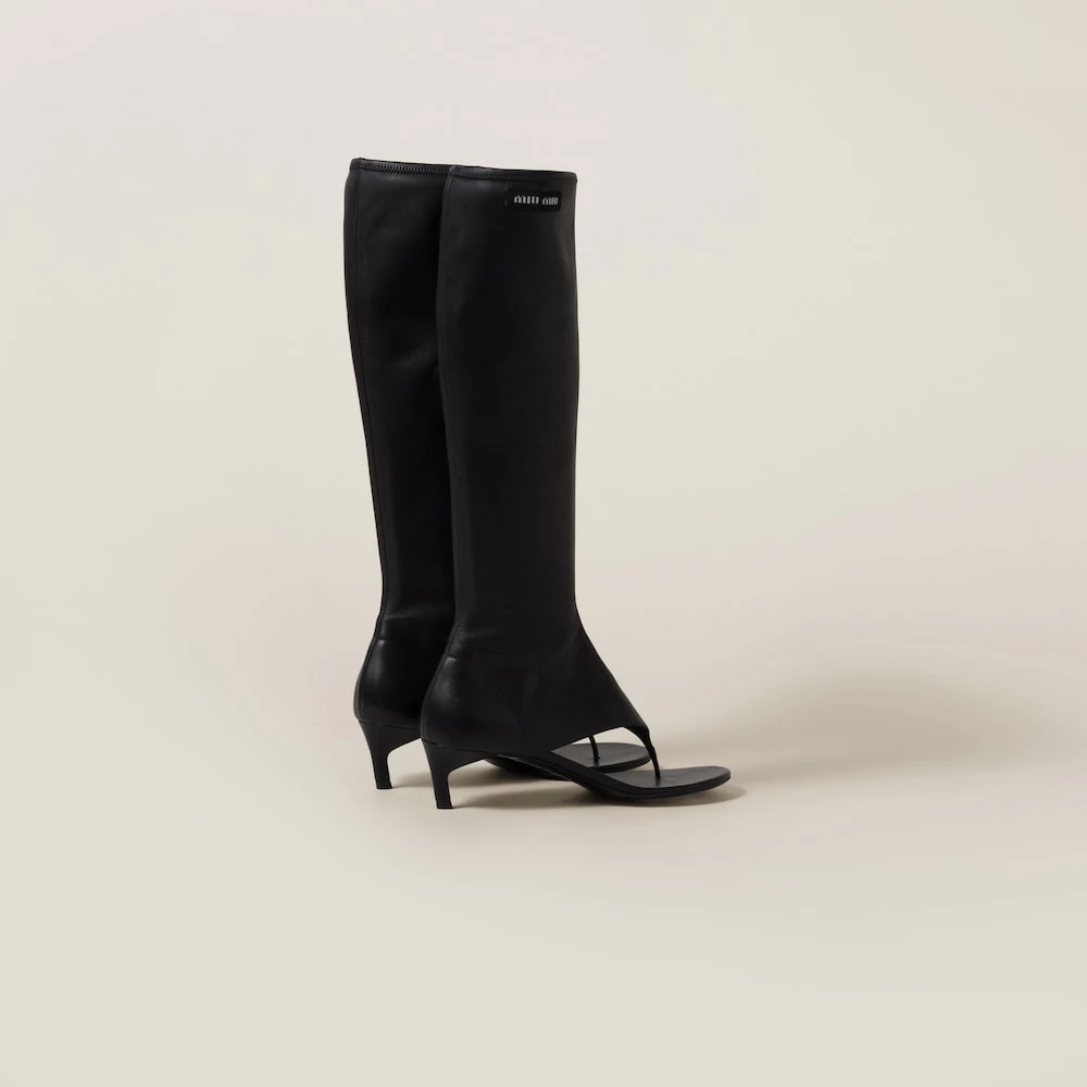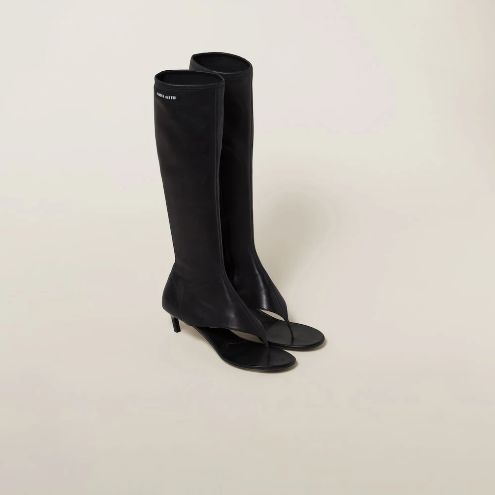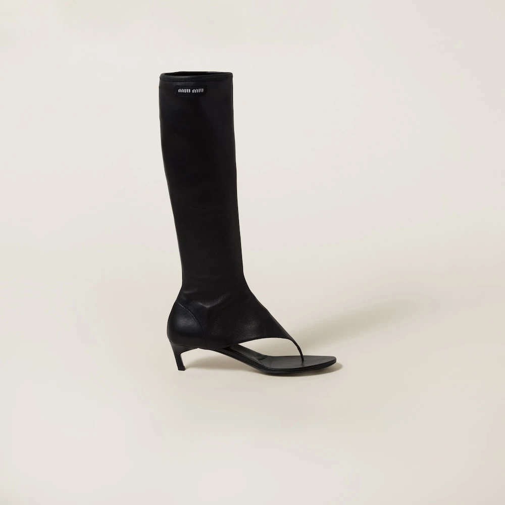 Captivating, feminine, and sophisticated: these stretch nappa thong boots are characterized by their cosmopolitan and extremely contemporary style. The encounter between two types of footwear accompanies the original design while the logo label decorates this new fashion statement.
