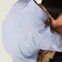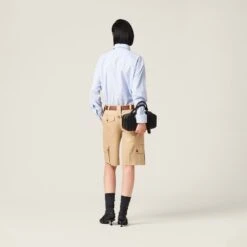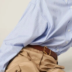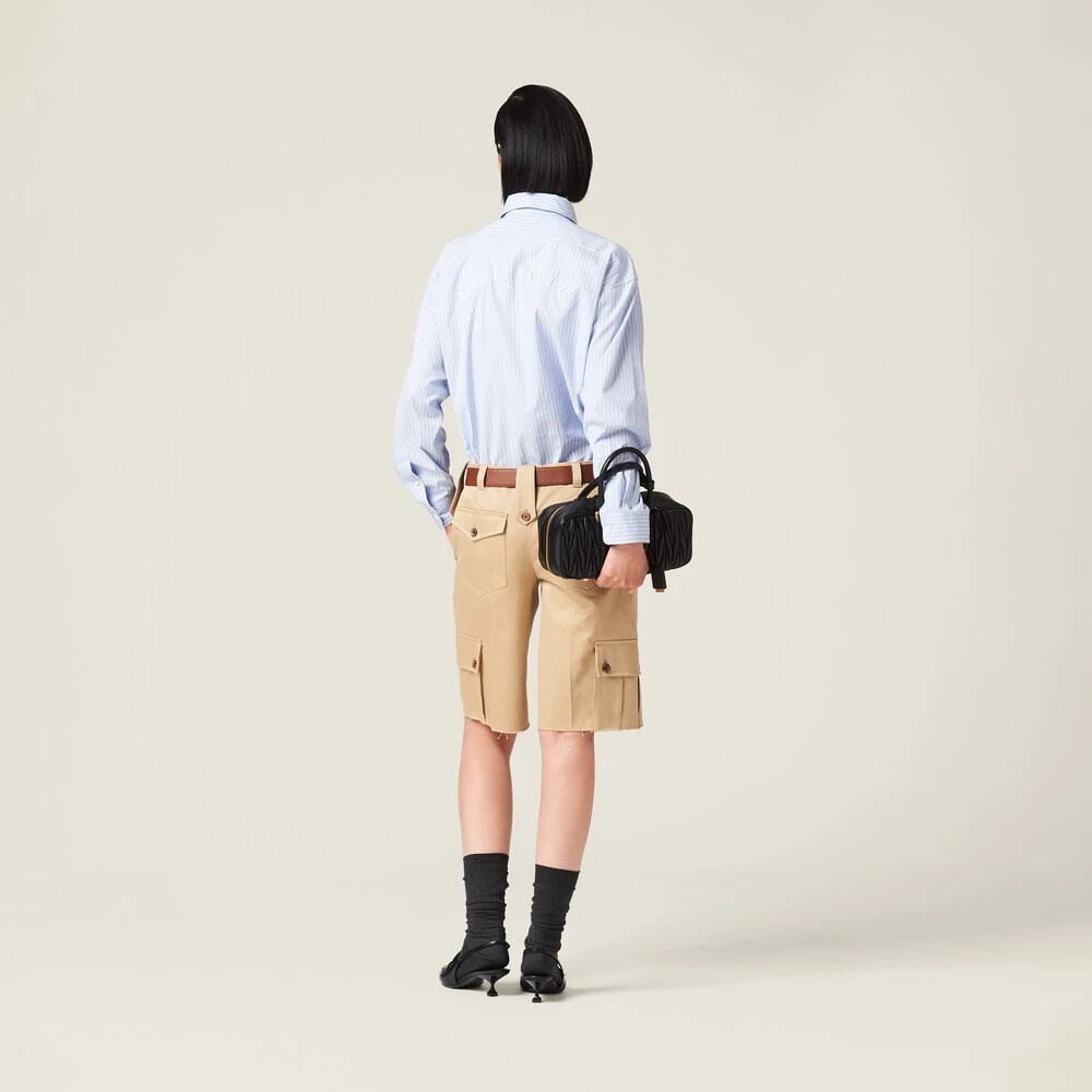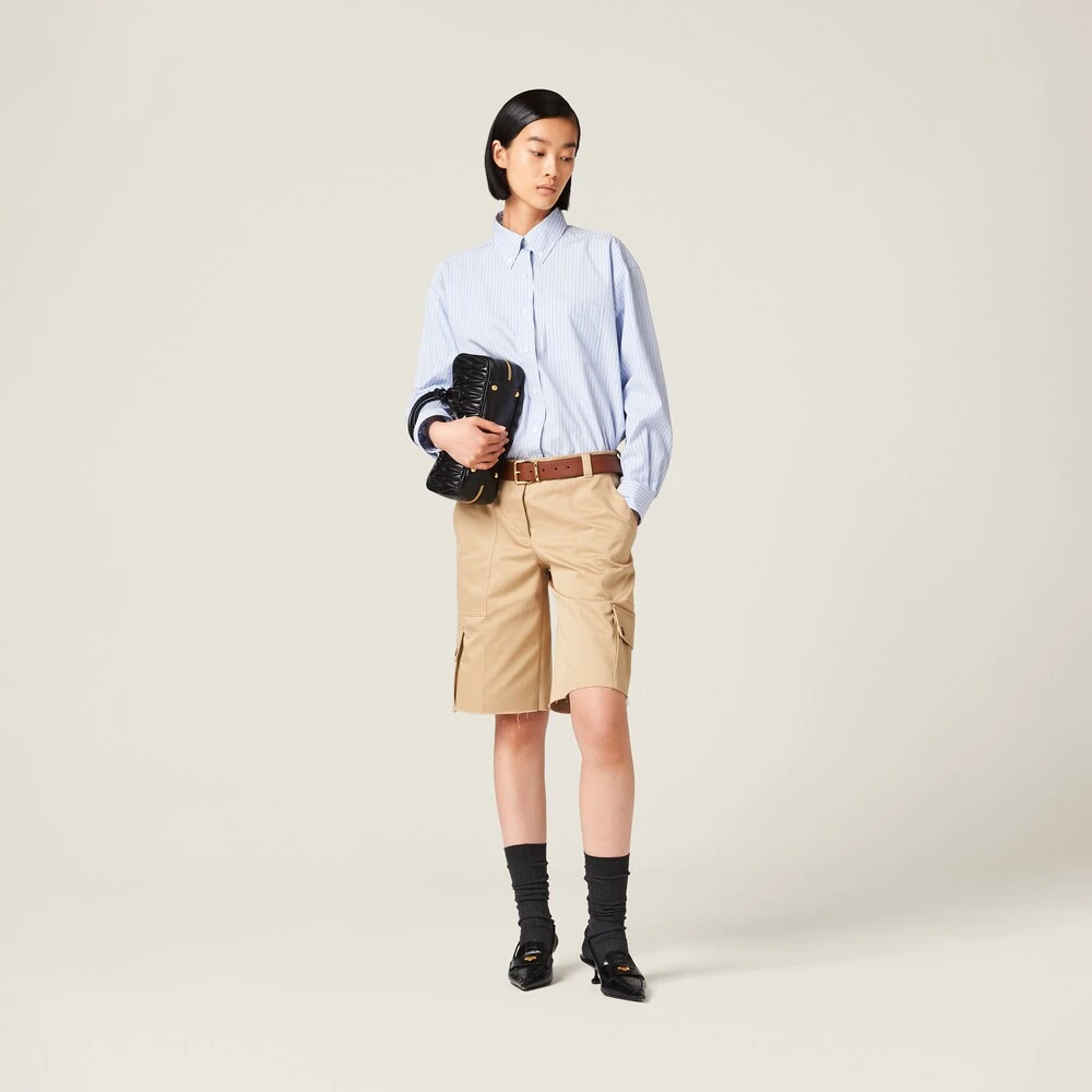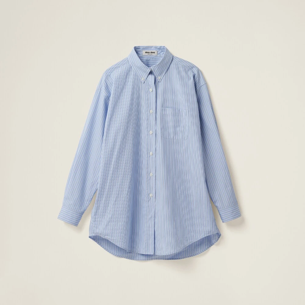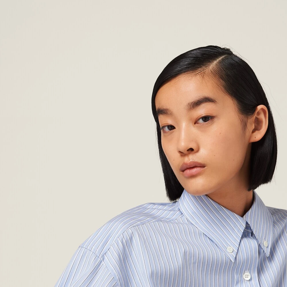 Menswear inspirations embrace a concept of rebellious, bold femininity in this new striped chambray shirt. Delicate seasonal colors create a refined harmony together with the embroidered lettering logo that completes the garment with an unexpectedly unique touch.