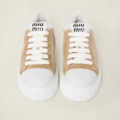 The casual character of the classic sneaker meets the soft feel of shearling. The iconic Miu Miu logo in a contrasting color on the tongue decorates this particular style.