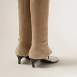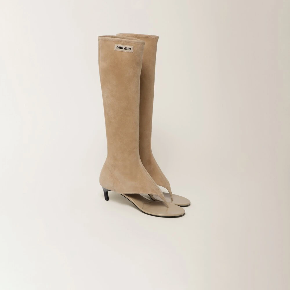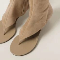These suede thong boots seen in the Spring-Summer 2023 show express a notion of fashion as a means of translating a reaction to current reality into material form. The boot is characterized by its cosmopolitan and extremely contemporary style. Captivating, feminine, and sophisticated: the encounter between two types of footwear accompanies the original design while the logo label decorates this new fashion statement.