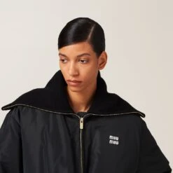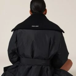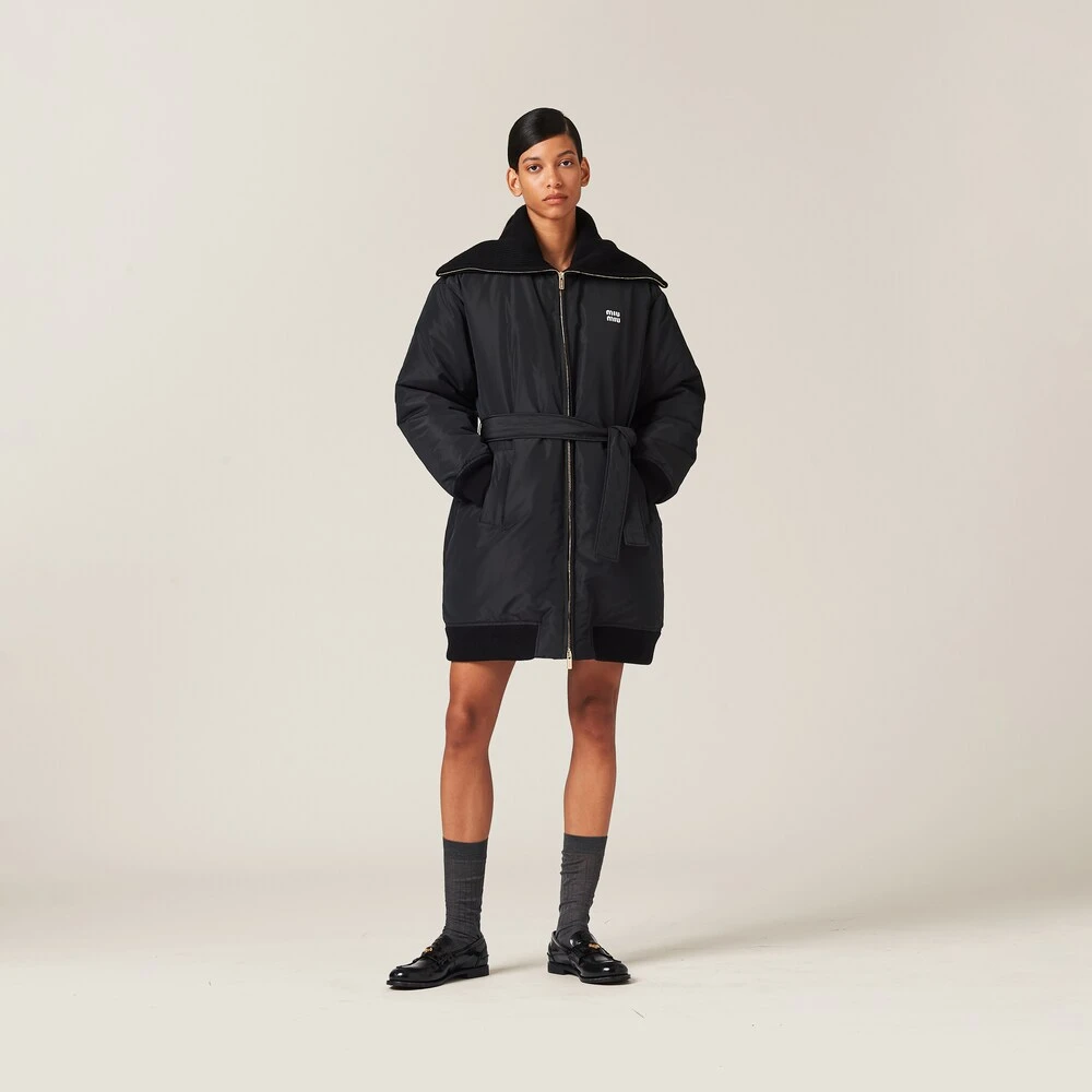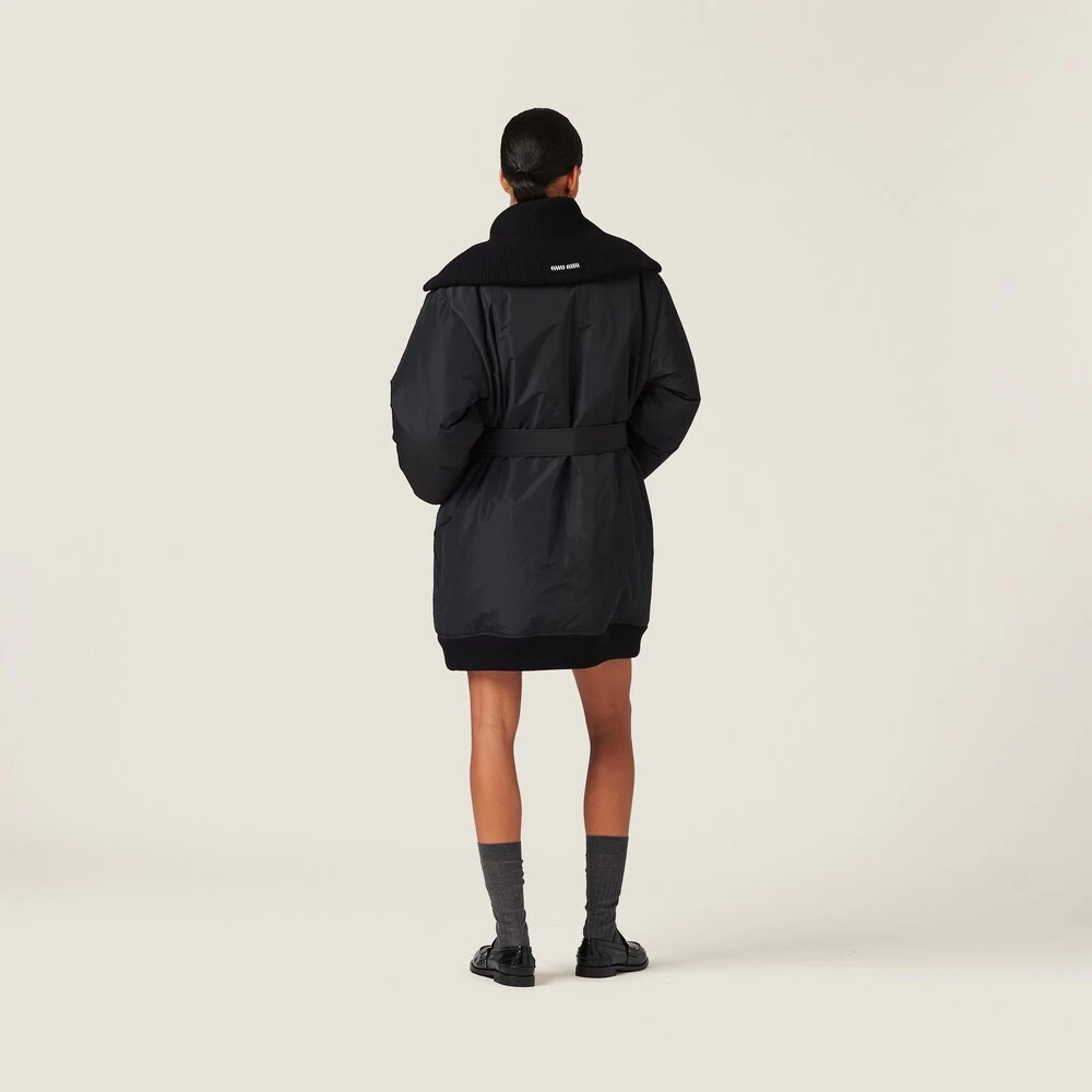 A casual yet refined style characterizes this technical fabric down coat. The collar, cuffs and hem share the soft texture of knit while the belt completes the look with a functional detail. The logo adds an iconic note to the garment.
