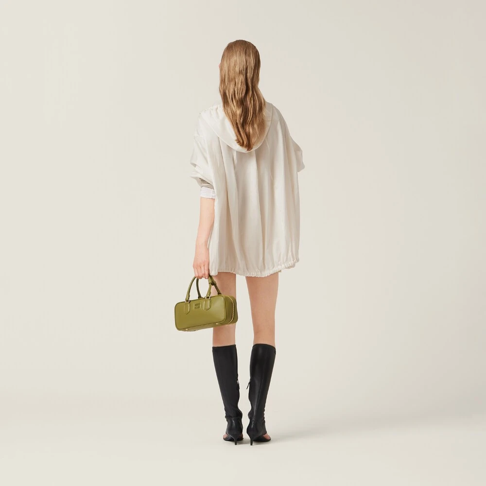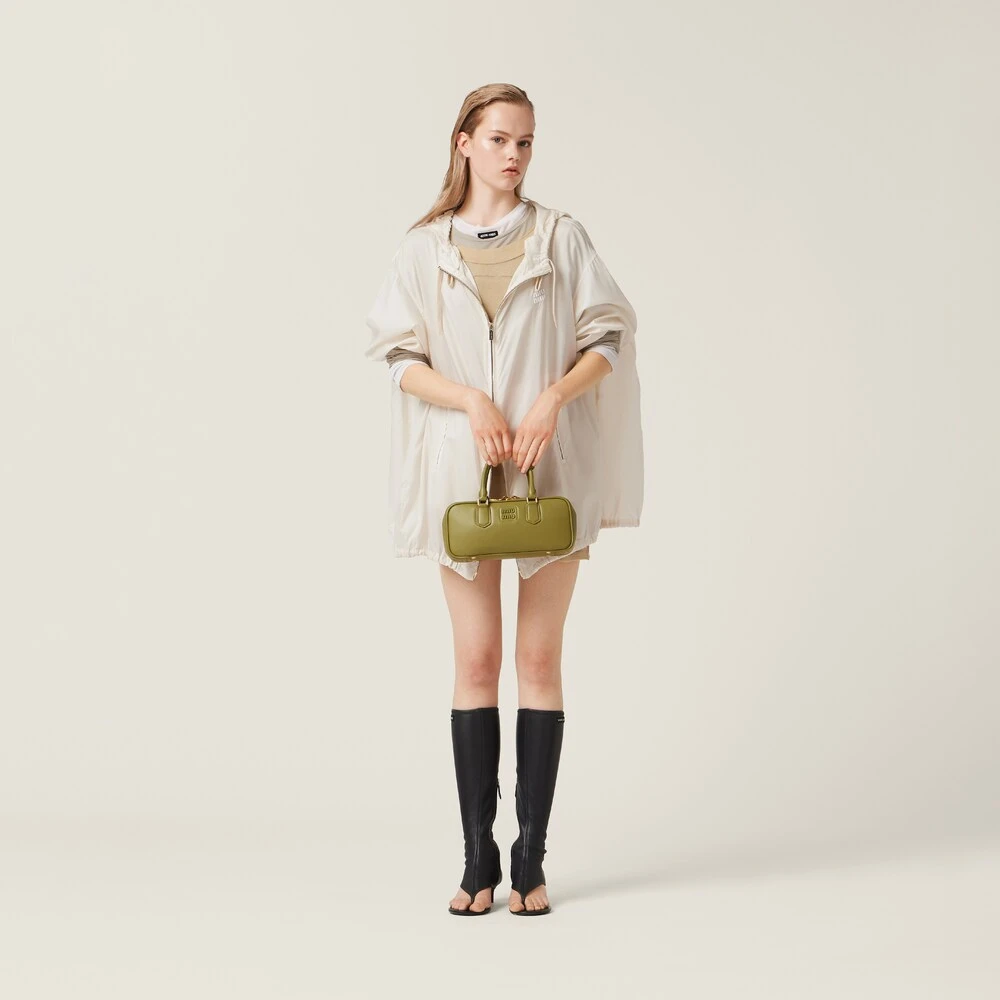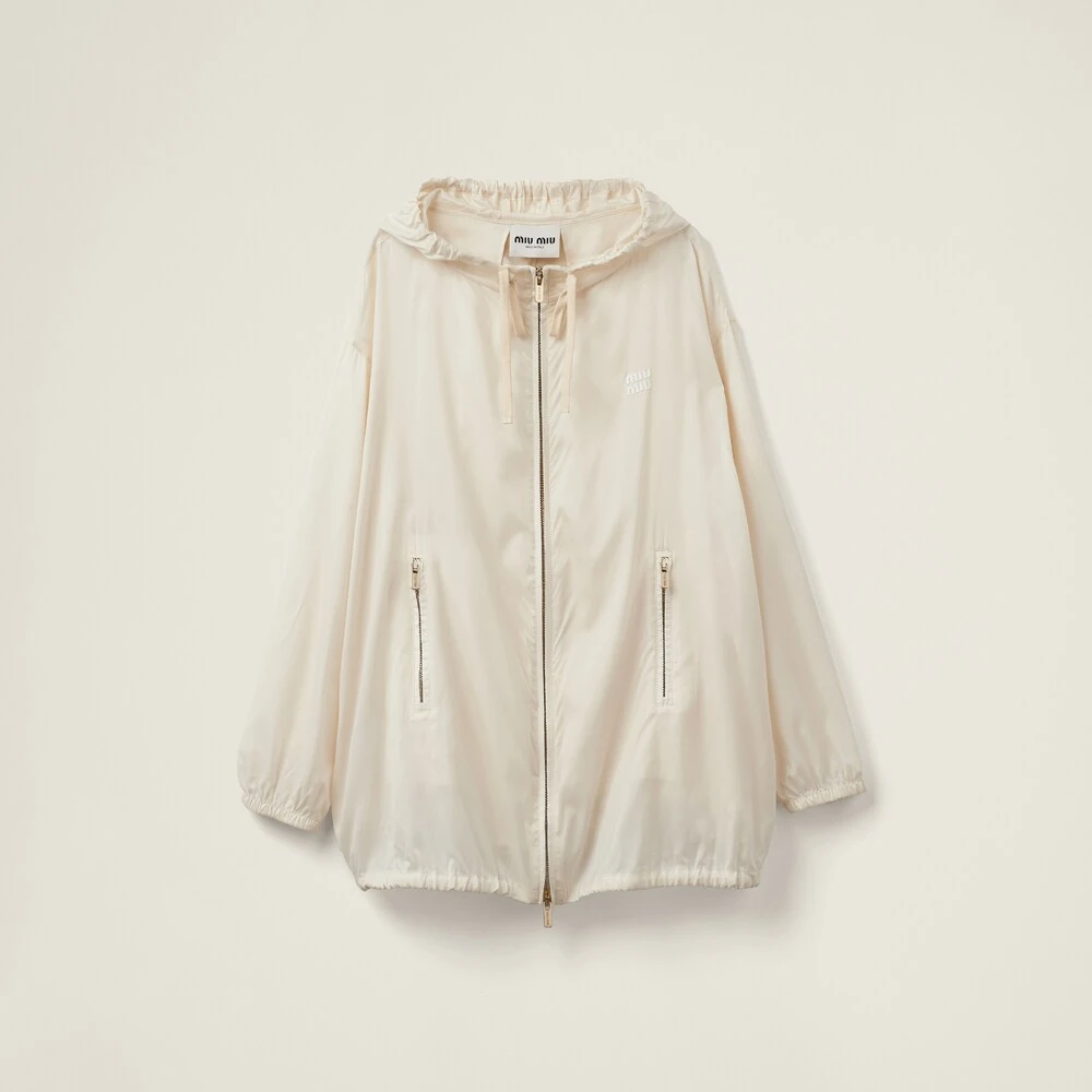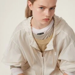 This technical silk blouson jacket, seen in the Spring-Summer 2023 show, expresses a notion of fashion as a means of translating a reaction to current reality into material form. The smooth, flowing garment with a sporty attitude was designed to arouse emotions and convey dynamic, irreverent, and bold femininity. The printed logo decorates the garment with an original, iconic and distinctive aesthetic.