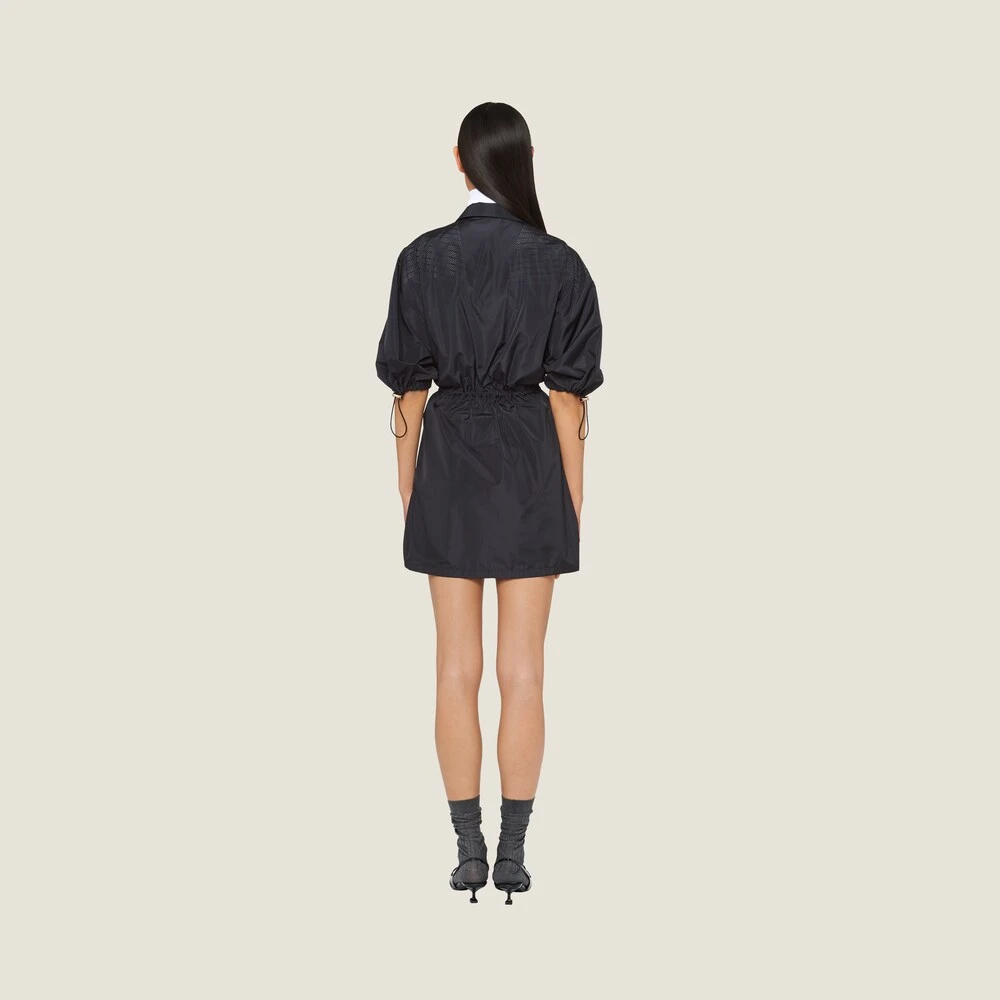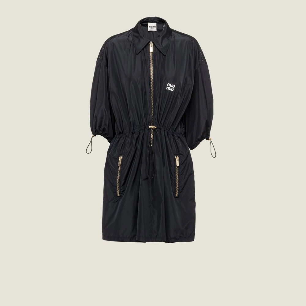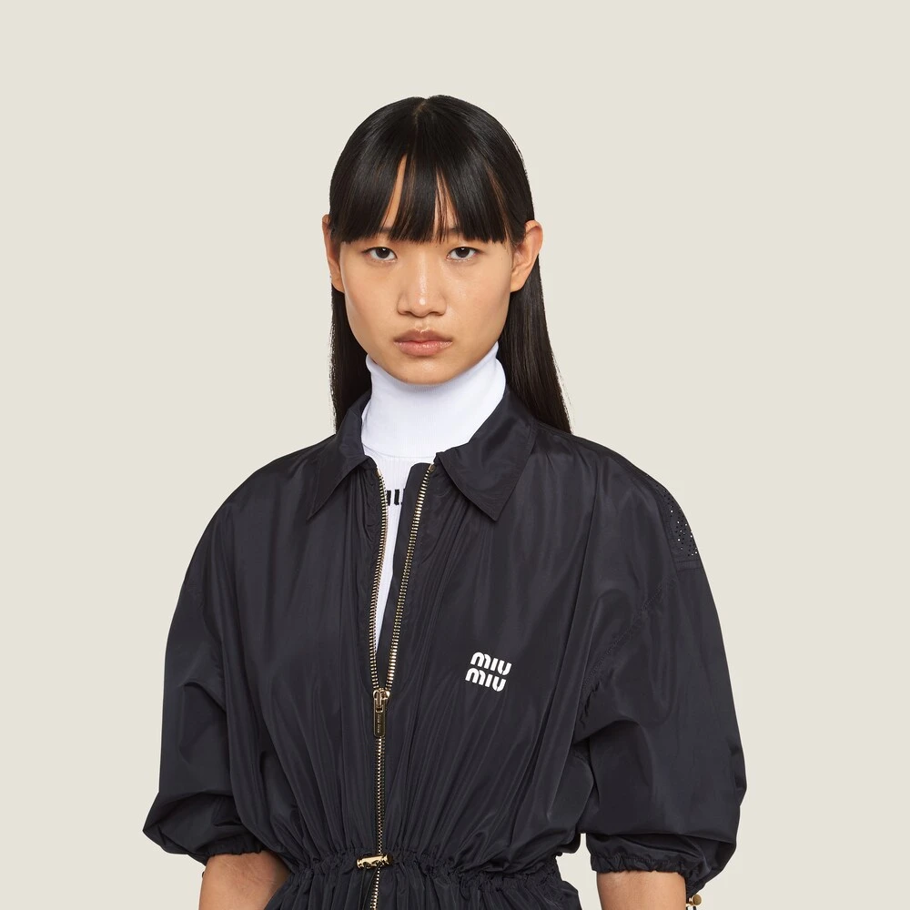 In this new technical silk mini-dress, Miu Miu’s subversive femininity is expressed through a play on proportions and a careful attention to detail. The printed logo stands out against the smooth fabric and the zippers introduce a refined contrast, while the drawstrings at the waist and on the sleeves create volume compared to the mini-dress silhouette, with a very refined yet bold final result.