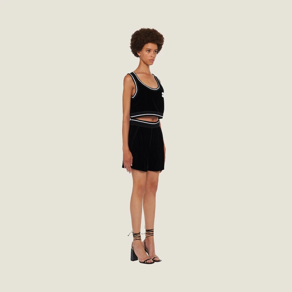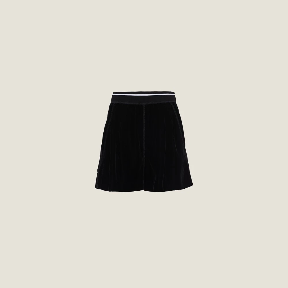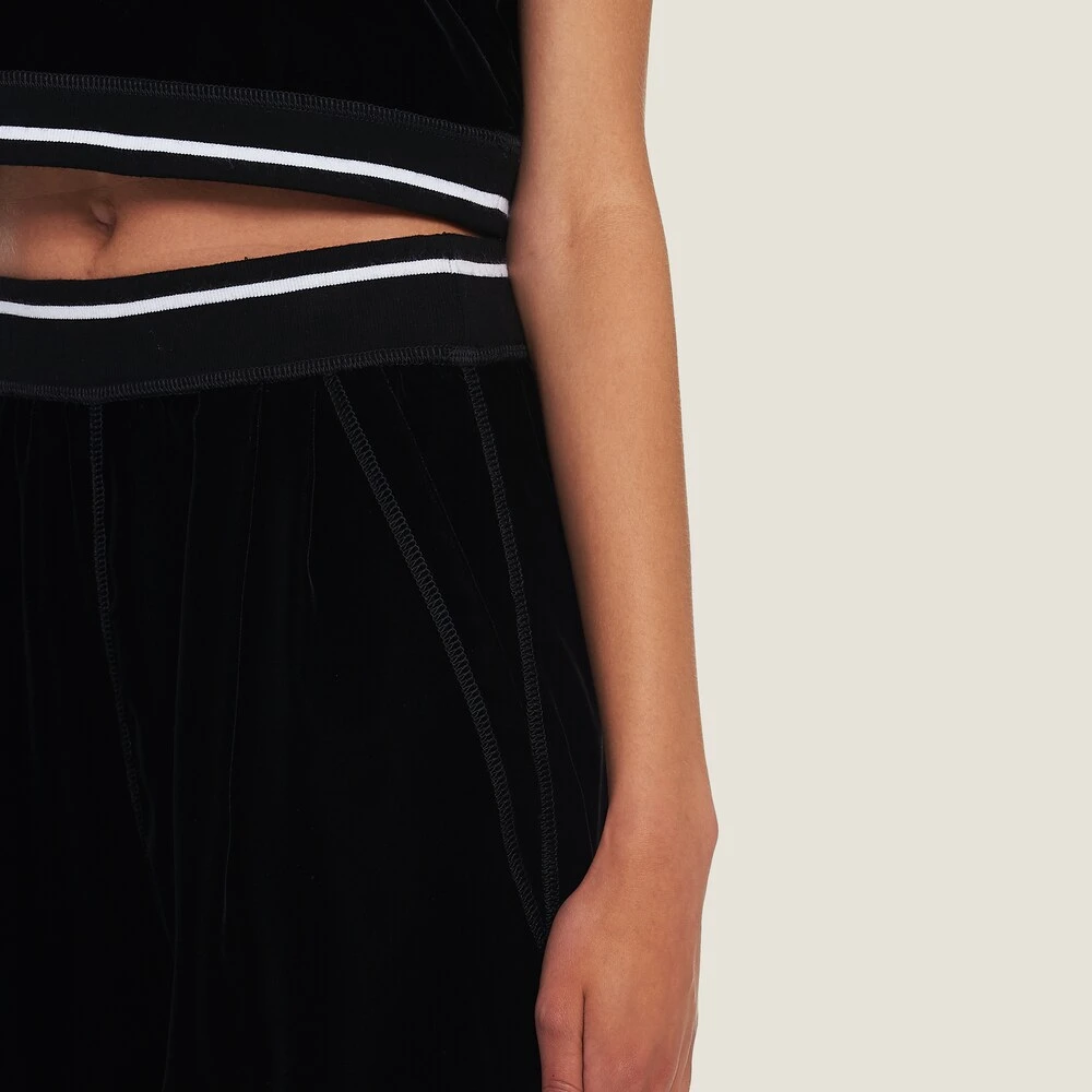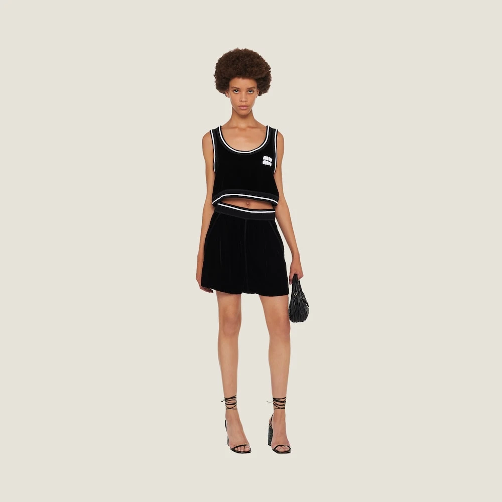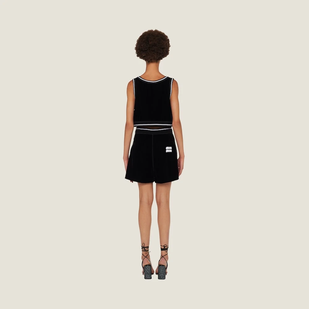 Velvet takes on a streetwear-inspired silhouette in these Bermuda shorts with contrasting Miu Miu logo. Classic wardrobe items reinterpreted for the new season, harmoniously blending style codes and new aesthetic languages.