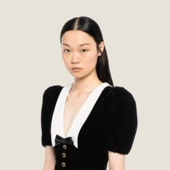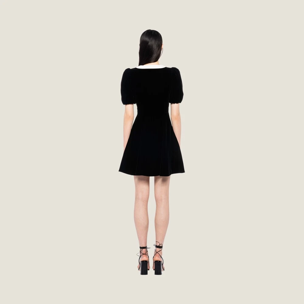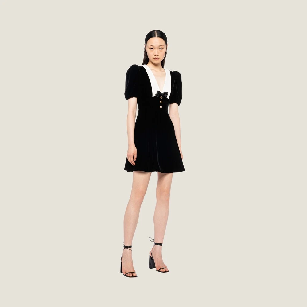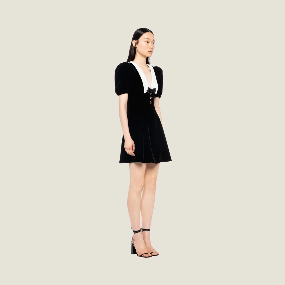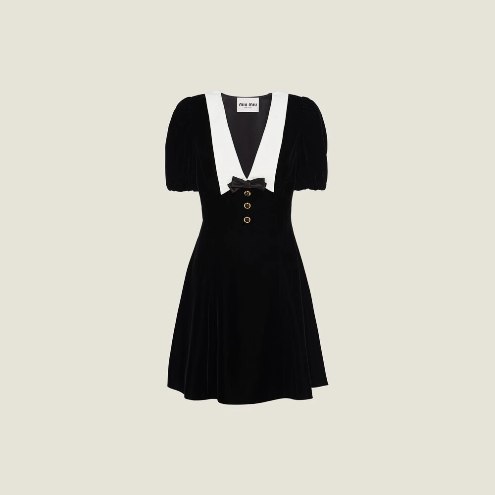 Defined by a romantic, elegant feel, this velvet mini dress subtly enhances feminine lines. The contrasting collar and deep neckline create a harmonious stylistic interplay with the velvet, creating a unique design.