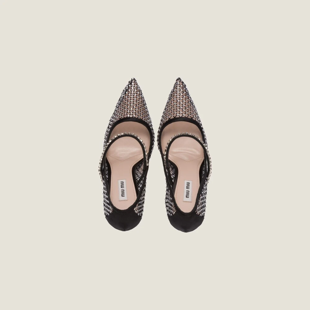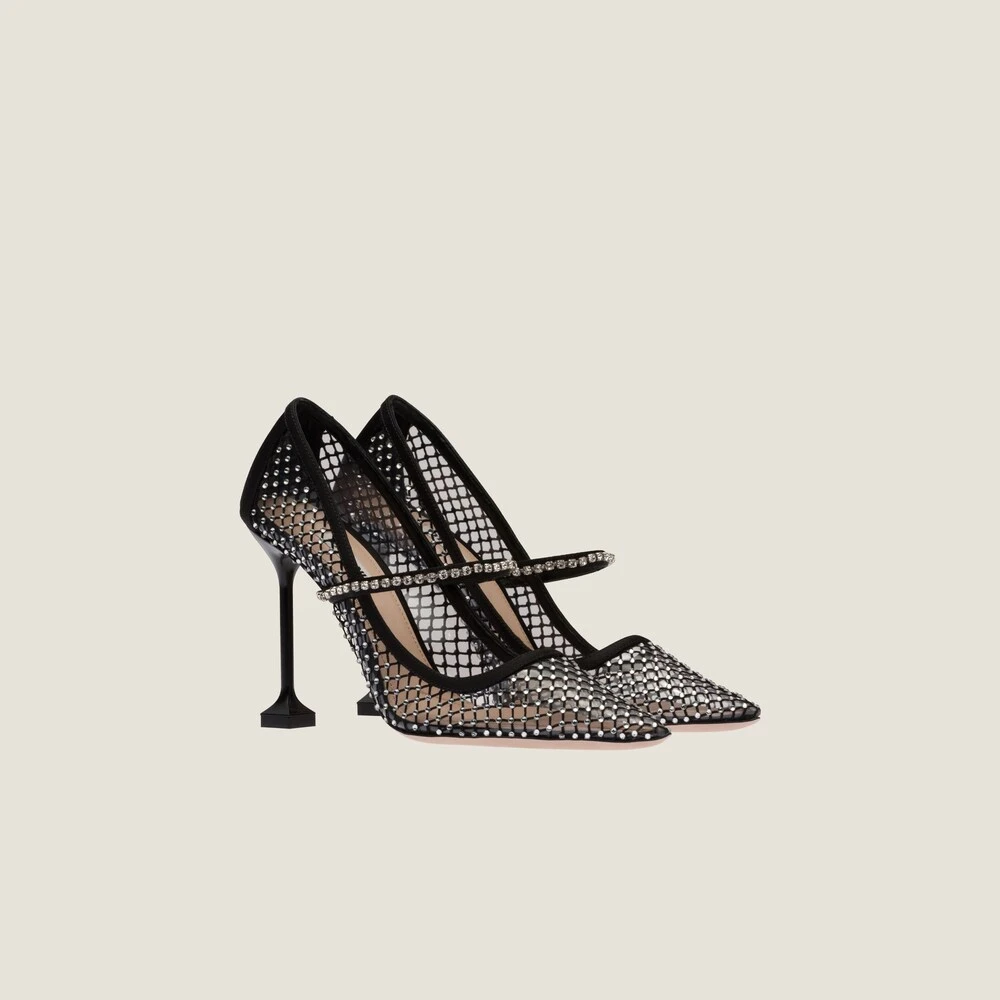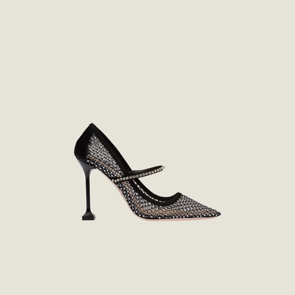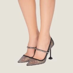 Elements of the jewelry world illuminate the sophisticated design of these pumps with crystal-studded Mary Jane strap.