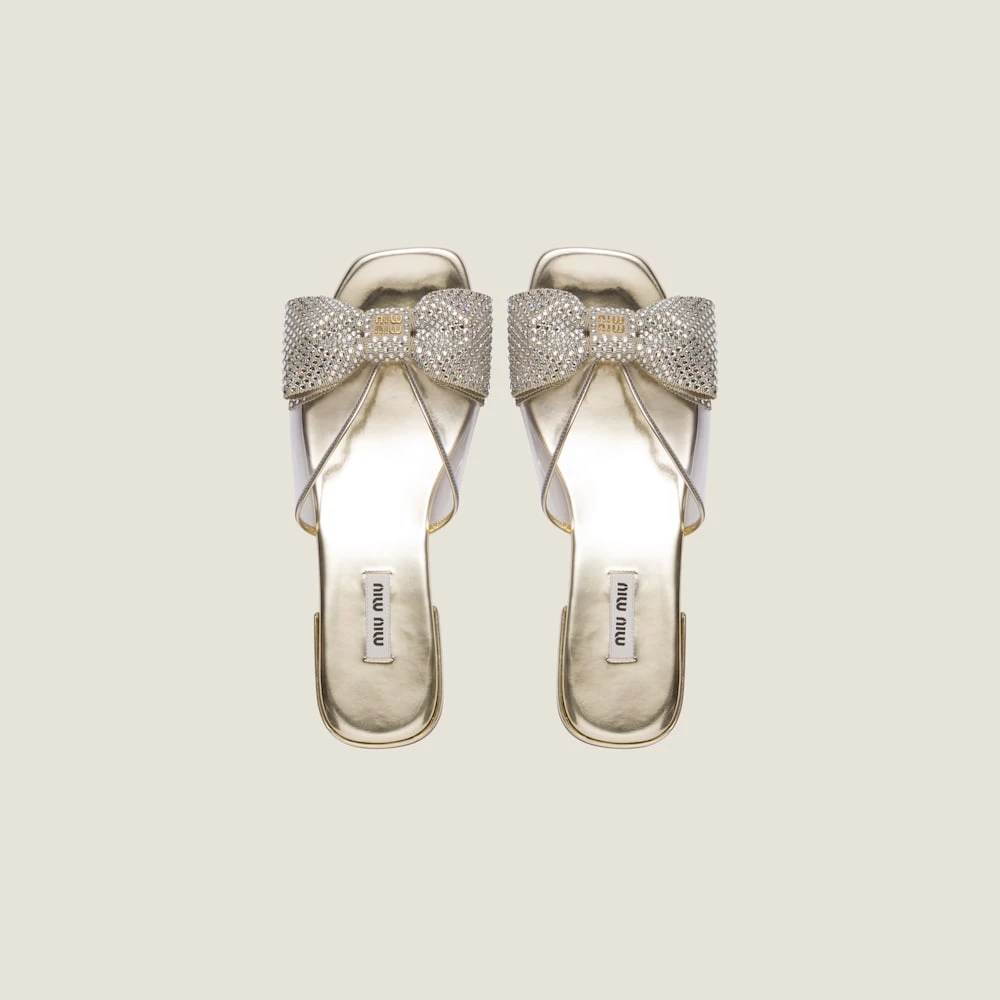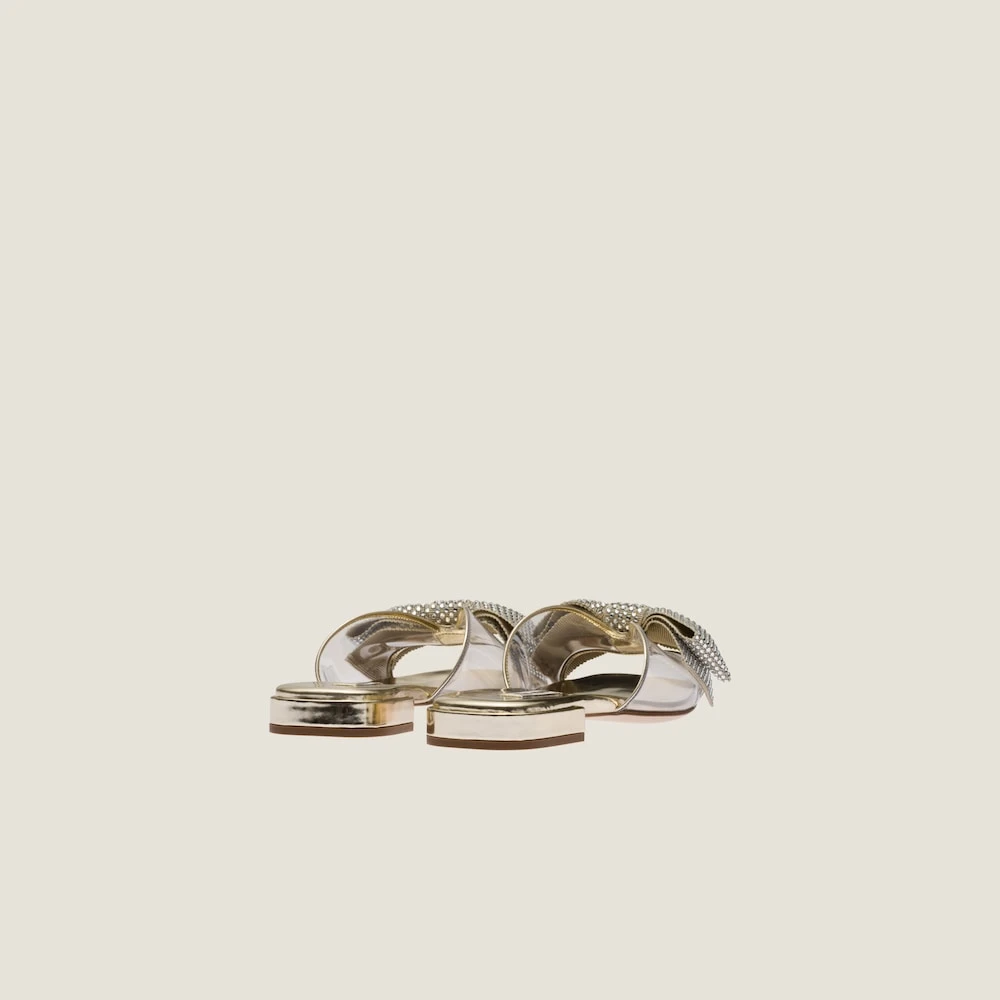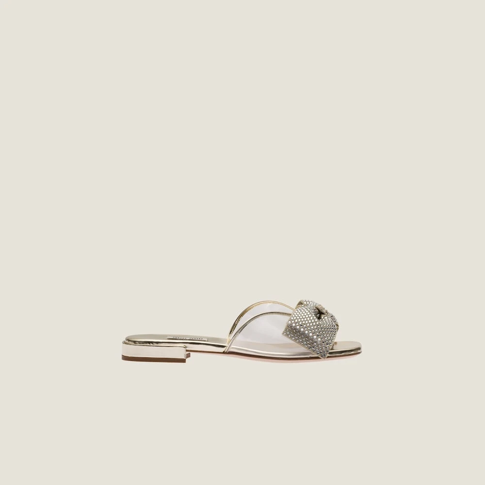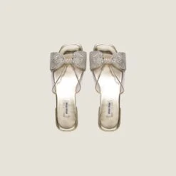 Miu Miu plays with transparent Plexiglas to create new designs with feminine character. This sandal embellished with a bow and crystals, perfect for the warm season, embodies playful modernity.