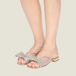 - Upper with bow with heat-sealed crystals and metal lettering logo