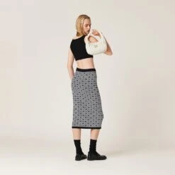 Iconic style is the protagonist in this new viscose skirt. The jacquard logo almost entirely covers the garment, linking it to irreverent femininity. The ribbed knit waistband and hem complete the skirt with a refined contrast.
