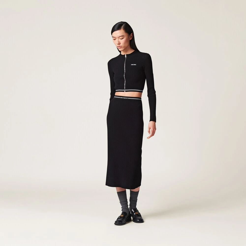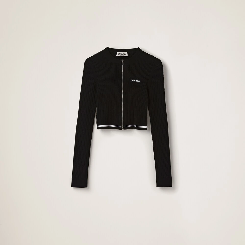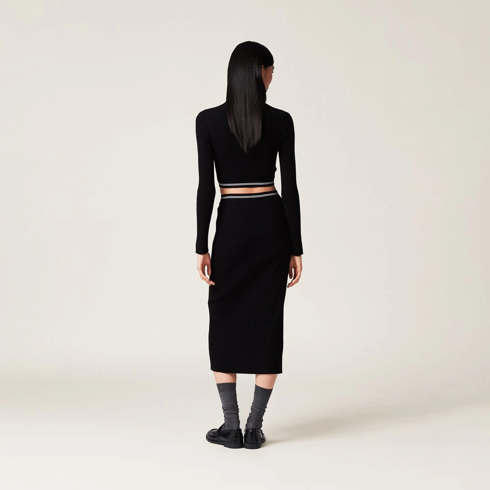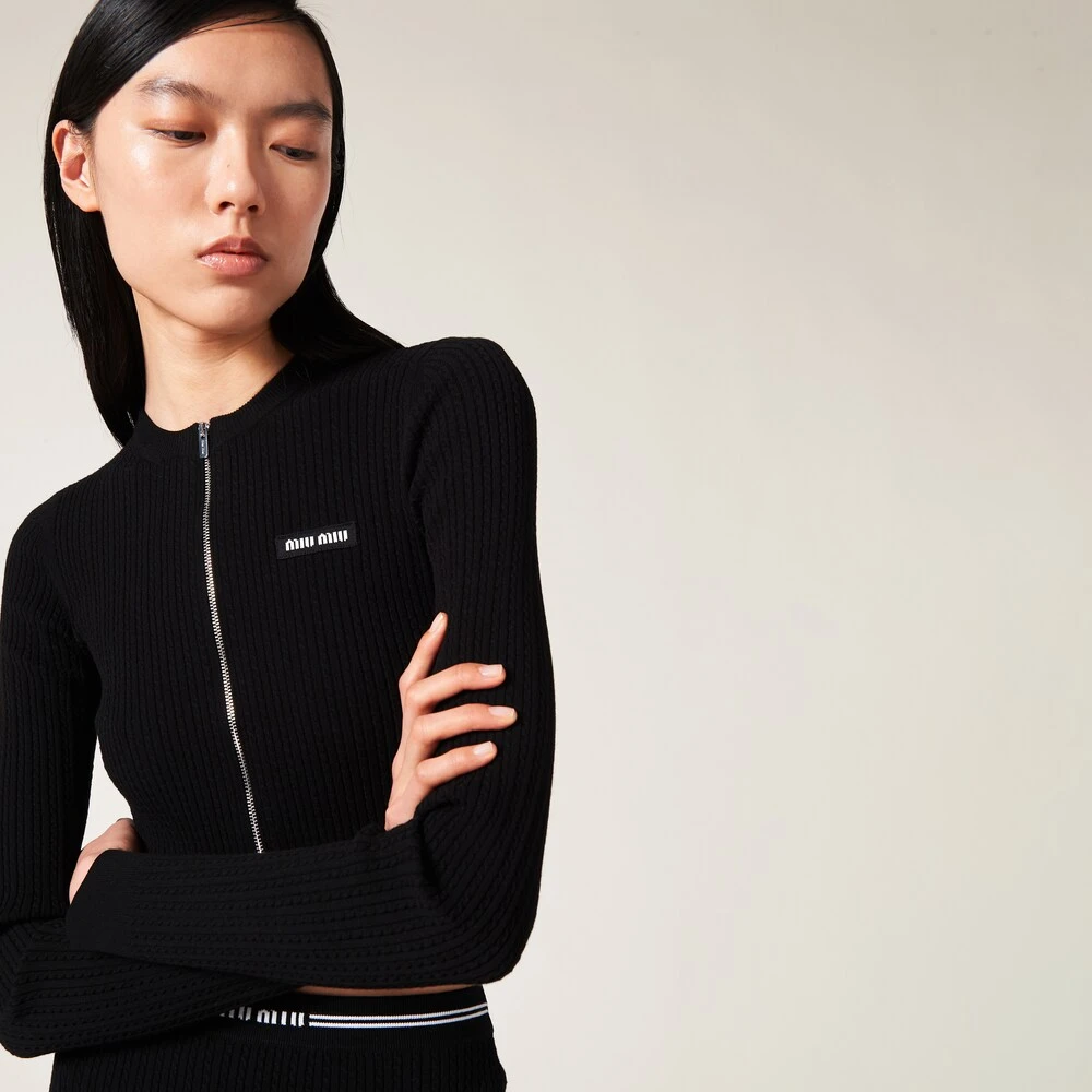 This viscose sweater combines a distinctly contemporary aesthetic with a casual style. The cable-stitch knit gives the garment a textured look. The cropped hem features a double horizontal stripe in a contrasting color while the knit logo patch completes the design with an iconic note.