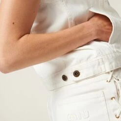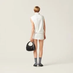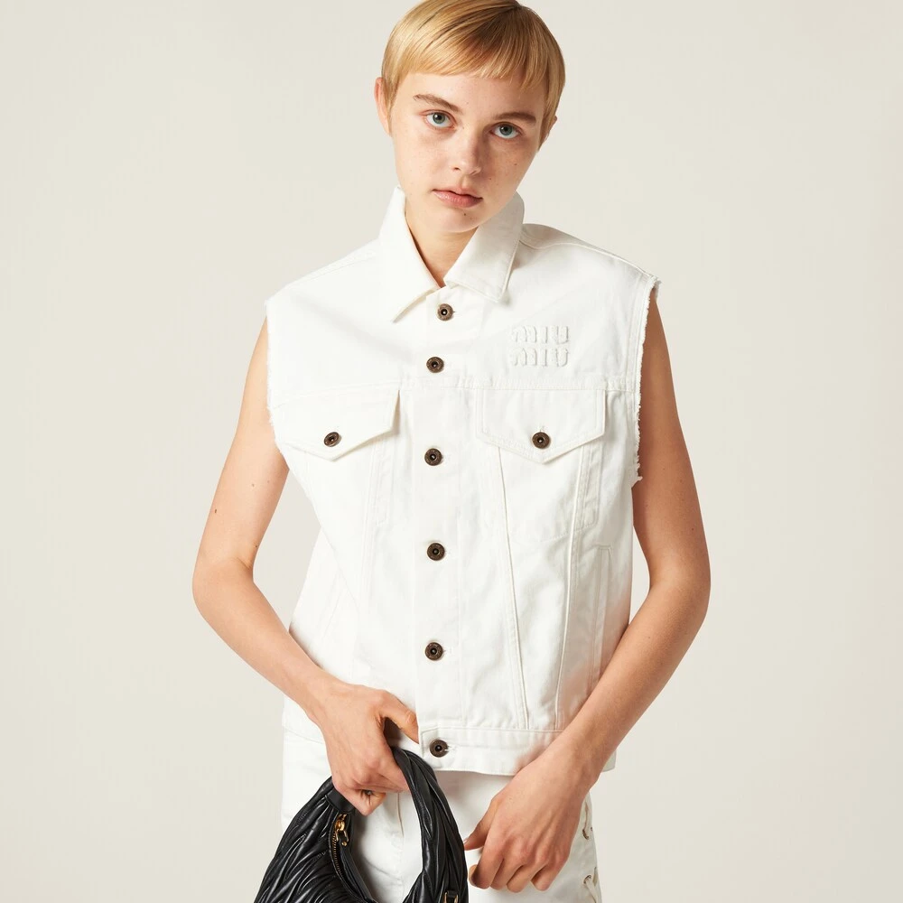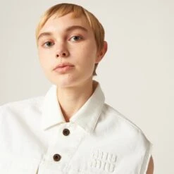 The timeless style of denim meets Miu Miu’s unconventional character in this new blouson jacket. The shirt-style collar coexists with the details of the breast pockets with buttoned flaps and with the tonal embroidered logo that completes the design with an iconic note.