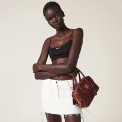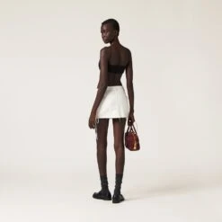 The lines of this miniskirt are enhanced by Miu Miu’s bold and irreverent character. The timeless style of denim is combined with refined details on the side and the logo that completes the garment with an iconic note.
