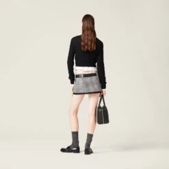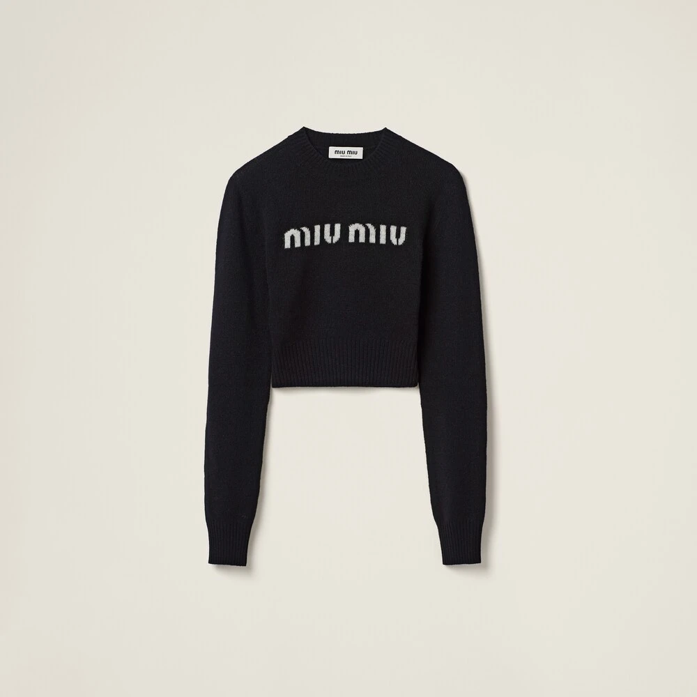 A bold look and effortless femininity characterize this wool and cashmere sweater. The cropped cut with a modern attitude is combined with the contrasting intarsia logo that completes the garment with an iconic note.