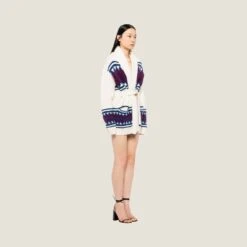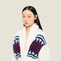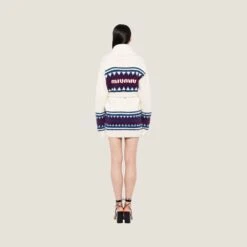 Hand-made embroidered geometric motifs with an alpine mood decorate this soft wool sweater. Blending craftsmanship and innovation, Miu Miu presents a sophisticated knitwear collection that combines different stylistic codes.